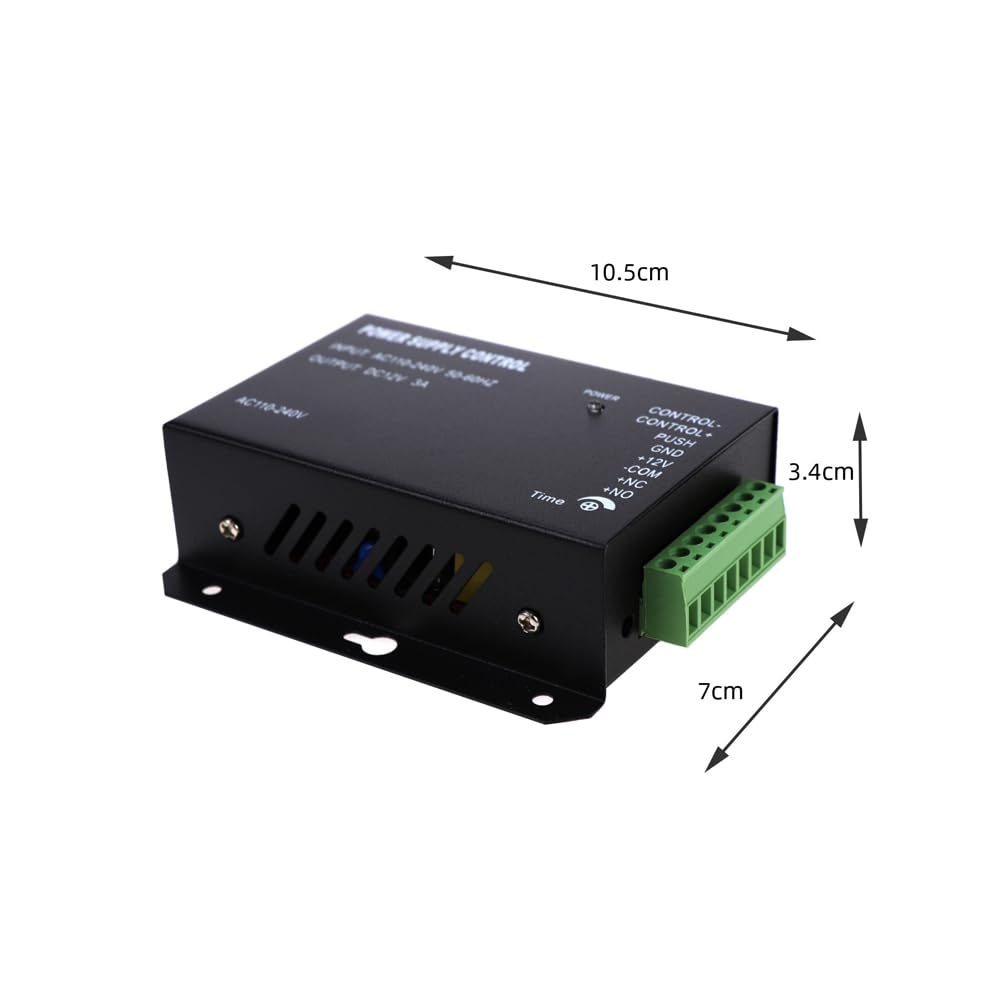 Feature: High efficiency and good price Built-in EMI filter 100% full load burn-in test Low output ripple and noise Protection: over load/over voltage/short circuit Based delay control circuit, lock time can be in 0-15 seconds Set NC / NO outputs, can control various types of electric locks Can reduce the load of access controller, save wiring to reduce the hidden trouble Specification: Dimensions: 120Lx95Wx38H(mm) Input Voltage: 110VAC~240VAC;50HZ~60HZ Output Voltage: DC12V;3A Contact: Access control, Electric Lock, Release Button Time Relay: 0~15sec Standard Design: Steel material, Painted Protect Safely: Short Circuit protection Suitable For: Access control, Electric lock Weight: 0.33kg Working temperature: -20~65 degree centigrade Package size: 13cm x 10cm x 4cm (5.12in x 3.94in x 1.57in)