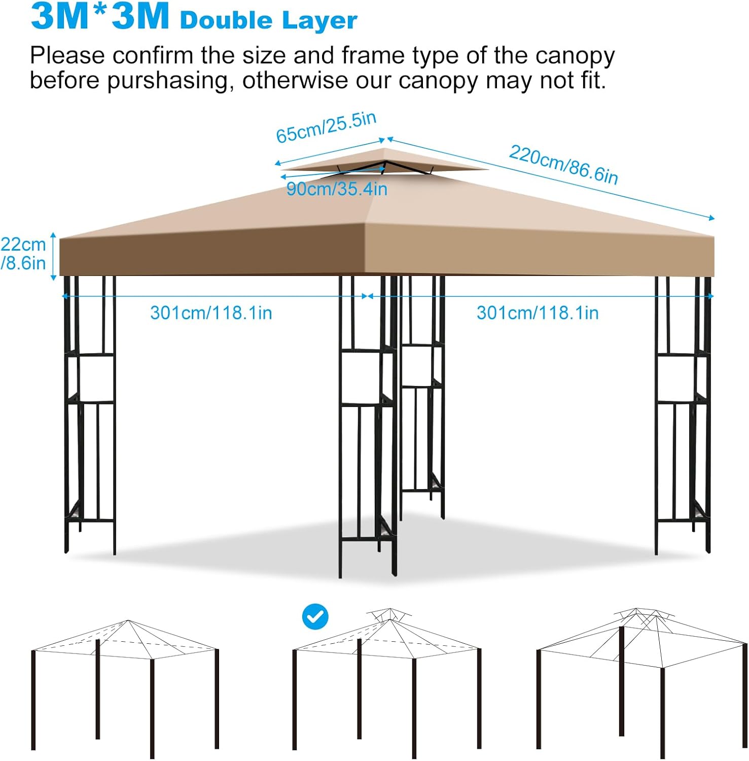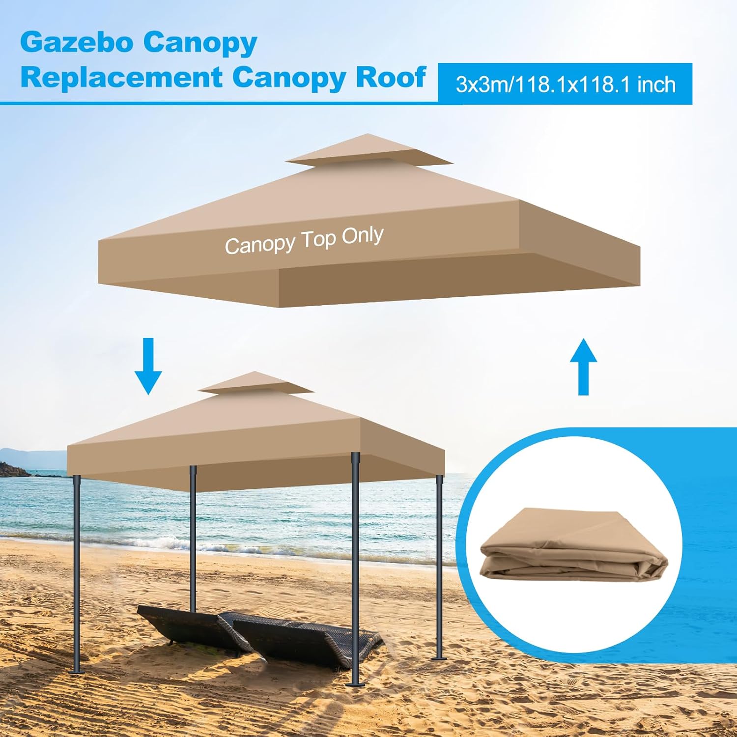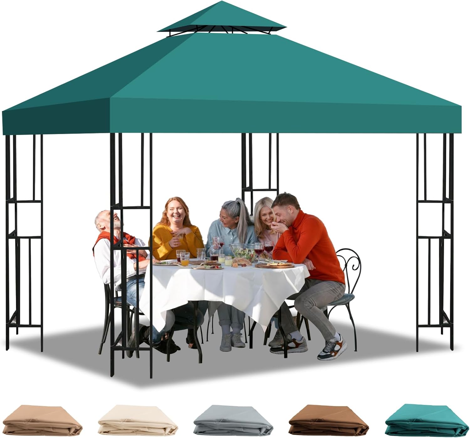 This 10×10 ft gazebo replacement canopy is designed for outdoor patios, gardens and yards, ideal for replacing worn canopies and upgrading gazebos to meet diverse outdoor needs; made of upgraded 300D polyester with waterproof PU and UV-blocking coatings, it is thick, durable and fade-resistant, blocking 99% of harmful UV rays and fully waterproof, able to withstand outdoor weather with long service life, while the double-tier ventilated top enhances air circulation, reduces temperature, allows wind and smoke to pass, maintains a cool and stable space on windy days, and prevents canopy damage from wind pressure; in addition, it features tool-free installation with convenient hook-and-loop strips, single-person operation completes in seconds, and it is foldable for compact storage, easy to carry, multi-functional for residential and commercial use, suitable for patio cooling, gatherings, barbecues, sports events, etc., and can also be used as a temporary carport for reliable shelter.