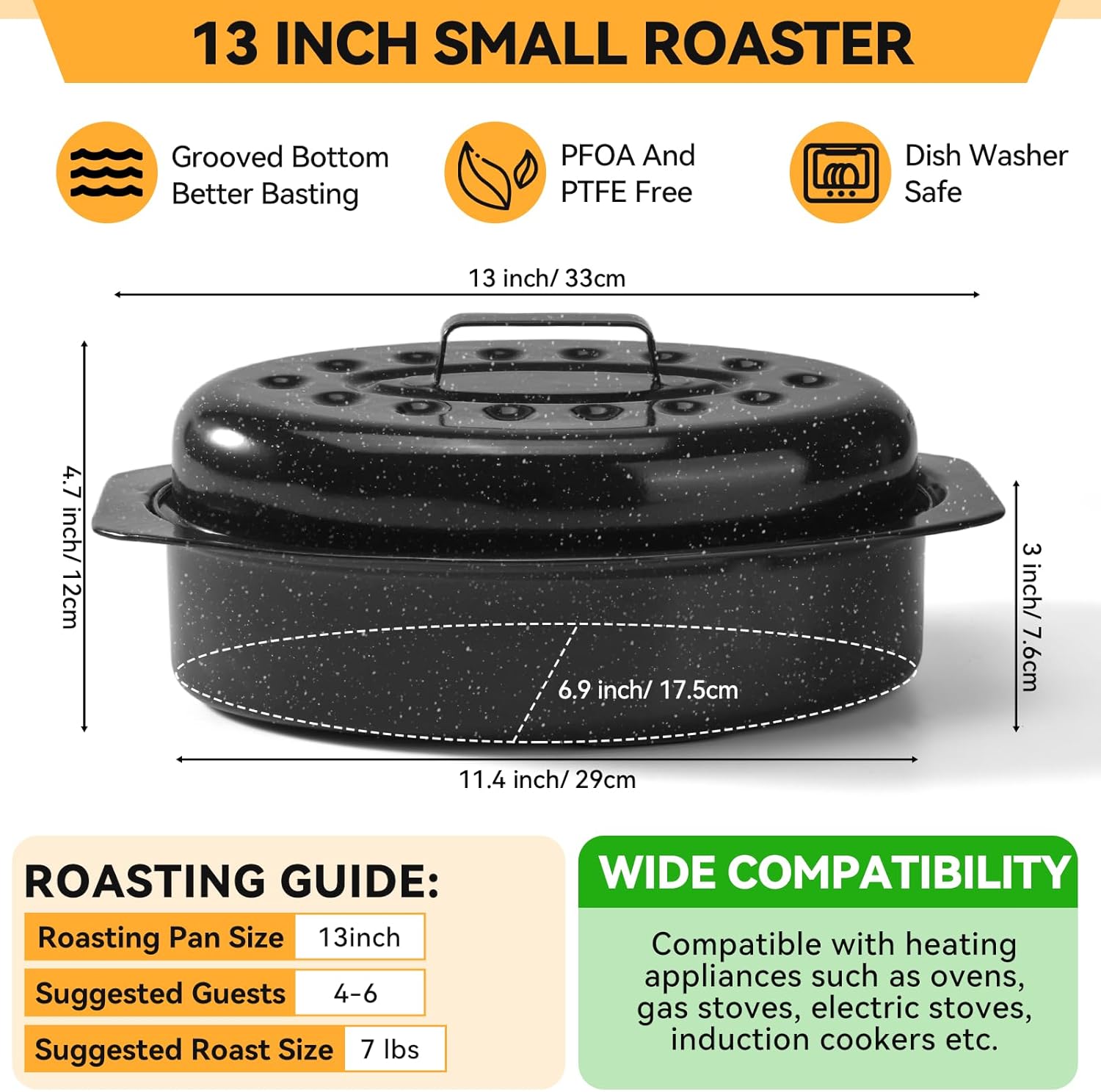 PACKAGE INCLUDED: 1 pc 13” Roasting Pan With Lid and 1 pc 15.4” Roasting Pan With Lid, save your time and energy to buy these roaster pan seperately.