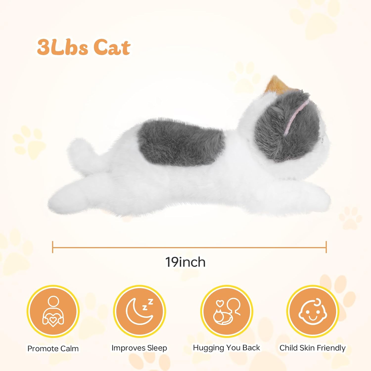 • 【Realistic Design】The 19" cat weighted stuffed animal, a perfect cuddle buddy for all cat lovers. With ultra-soft faux-fur and a floppy body, it's ideal for snuggling. Its lifelike details, from cute nose to fluffy tail, make it look like a real kitty. A must-have plush cat toy for your collection or a new friend to keep you company, guaranteed to bring smiles