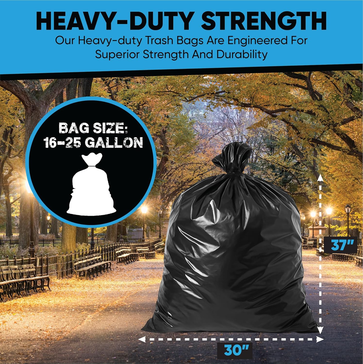 These 16-25 gallon black trash bags work with many different trash cans – a reliable choice for home, office and commercial use.FITS 16, 17 & 18 GALLON CANSUsing a 16, 17, or 18 gallon trash can? These bags fit snugly without extra plastic hanging over the edges. They’re perfect for kitchens, office break rooms, and shared workspaces. Capable of handling daily household trash, paper waste, and other light disposal needs.GREAT FOR 19, 20 & 21 GALLON CANSIf you need liners for 19, 20, or 21 gallon trash cans, these bags provide a little extra space without being too loose. This size is commonly used in restaurants, cafes, and small commercial spaces where trash fills up fast. Designed from strong tear- resistant plastic with reinforced seams to prevent leaks and hold up to food waste, paper products, and packaging.RELIABLE FOR 22, 23 & 24 GALLON CANSHave a 22, 23, or 24 gallon trash can? These liners will still fit securely while giving you more room for bulkier trash. Ideal for trash cans found in retail stores, schools, gyms, and janitorial carts, where a mix of lightweight and heavier waste builds up quickly. The black color keeps trash out of sight.EXTRA CAPACITY FOR 25 GALLON CANSWhen you need maximum capacity, these bags expand to hold up to 25 gallons. A smart choice for warehouses, event venues, hotels, and public areas. Designed with enough space and durability for larger loads without tearing or stretching too thin.PRODUCT SPECIFICATIONS:Color: BlackCapacity: 16-25 GallonsCount: 540Closure Type: Tie-Top (Non- Drawstring)Packaging: Coreless Perforated RollsMaterial: Standard Strength Plastic