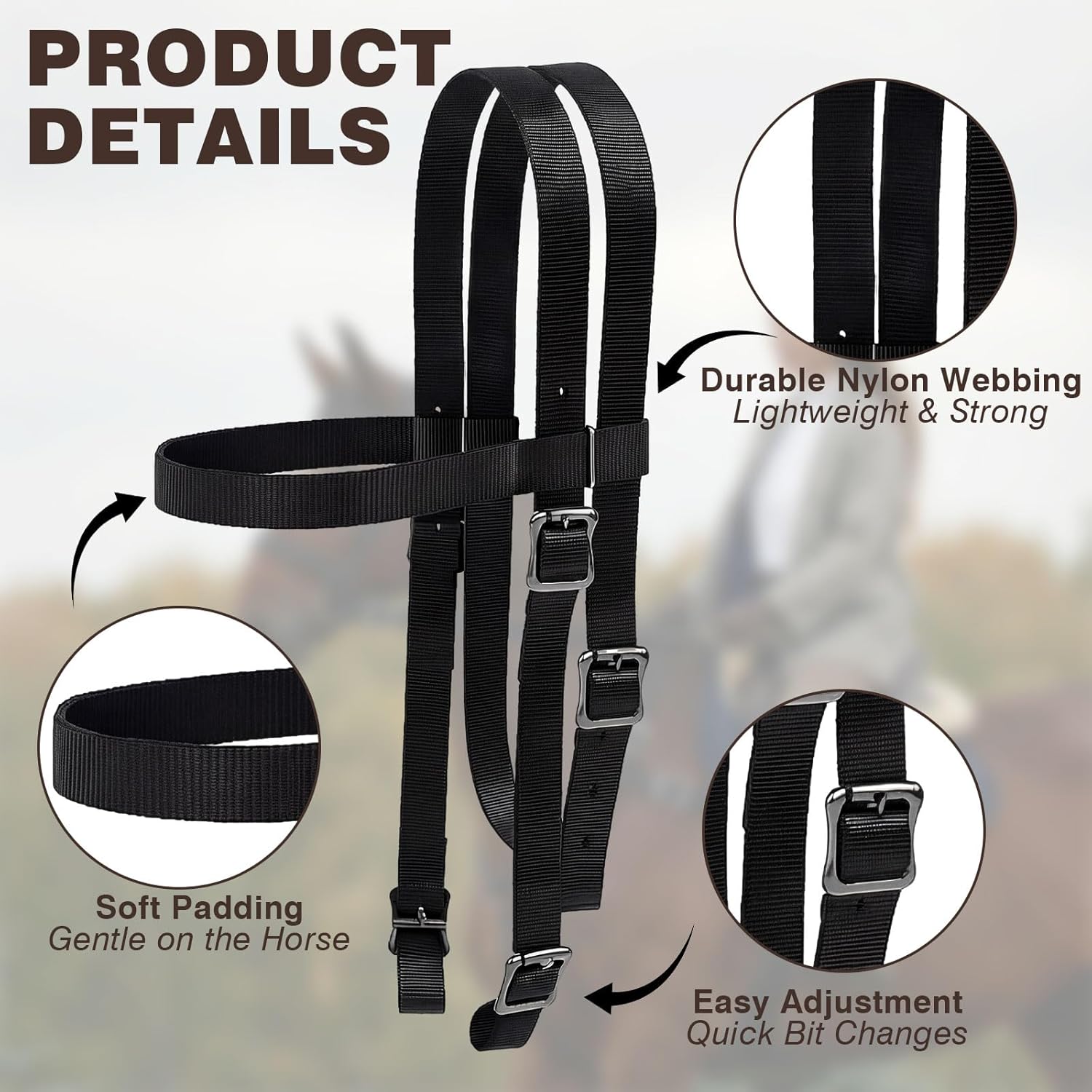 Features: Sleek and stylish look: Available in an elegant black color, this bridle complements your horse's appearance. Its classic design adds a touch of sophistication, making both horse and rider stand out on trails or at events. Versatile for various occasions: Ideal for equestrian enthusiasts, this nylon bridle is suited for various riding situations, from competitive events to leisurely trail rides. Its versatility meets the diverse needs of riders, ensuring a good performance every time. Specifications: Material: nylon Color: black Size: Throat latch: about 40-44 inches Reins: about 84 inches long Package includes: 2 x Horse headstall with reins Notes: Manual measurement, please allow slight errors on size. The color may exist a slight difference due to different screen displays. Winding risk may exist, please be careful while using