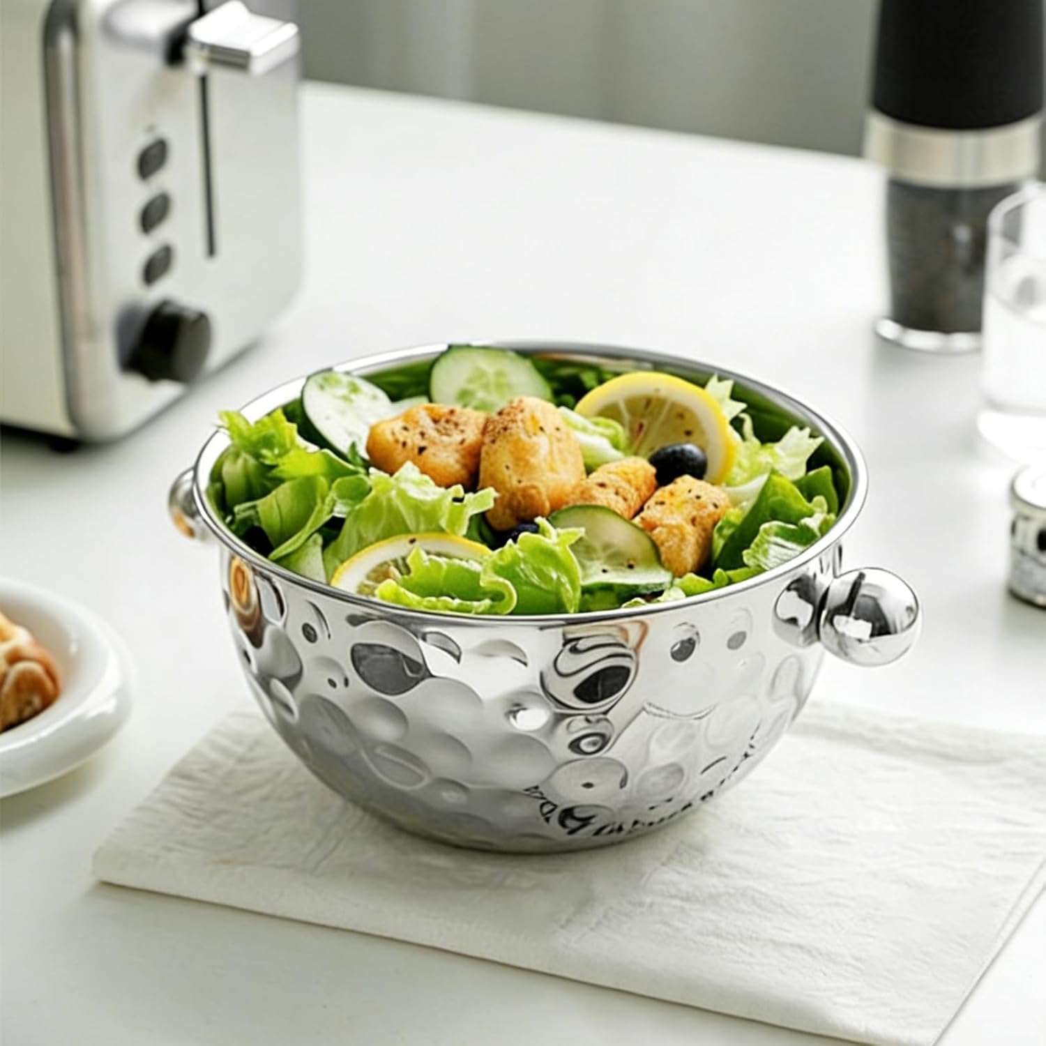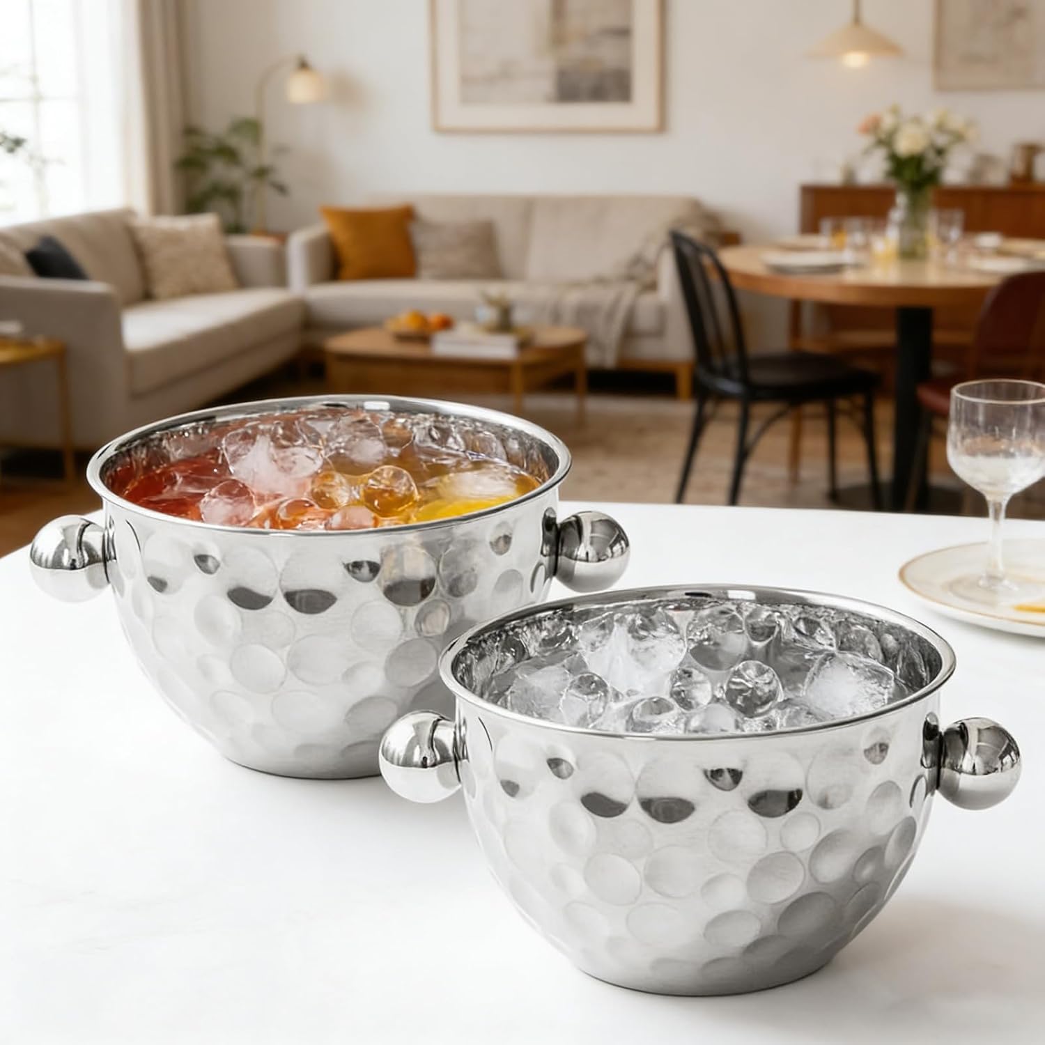 2 Piece Hammered Finish Stainless Steel Mixing Bowl with Handle Ice Buckets Beverage Tubs For Restaurants Home Kitchens Features: Premium Stainless Steel – Crafted from stainless steel, this hammered mixing bowl excellent resistance and durability Ideal for daily kitchen use or outdoor gatherings, it resists oxidation and rust while ensuring and hygiene Unique Hammered Design – The carefully crafted hammered surfaces enhances both aesthetics and grip stability Each bowl features distinctive textured, adding artistic charm to your kitchen while making cooking more enjoyable and secure Versatile Multi Purpose Use – Perfect for food preps, mixing batter, or serving as a drink chiller Whether tossing salads, marinating dishes, or keeping beverages cool at parties, this stainless steel bowl adapts to needs Easy to & Maintain – The smooth stainless steel surfaces allows quick with just warm water and detergent Dishwasher safe and to extreme temperatures, it simplifies kitchen upkeeping without compromising Stylish Kitchen Essential – Elevates home dining, picnics, or buffet setups with this elegant hammered bowl Its modern yet timelessly design blends seamlessly into any decor, making it a must have for stylish households Specifications: Component: Stainless Steel Color: Silver Diameter: approx 24cm / 9.44 + 26cm / 10.23in Package Includes: 2pcs 24cm+26cm stainless steel wine buckets ( 2 different sizes) Note: Please allow 1-3cm error due to manual measurement please make sure you not mind before you bid Due to the differences between different monitors, the picture may not reflect the item actual color