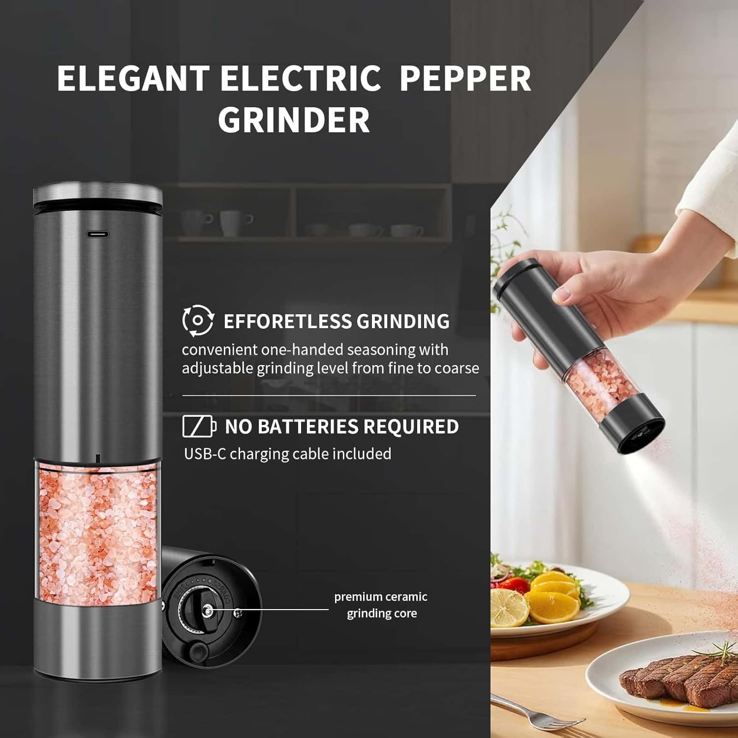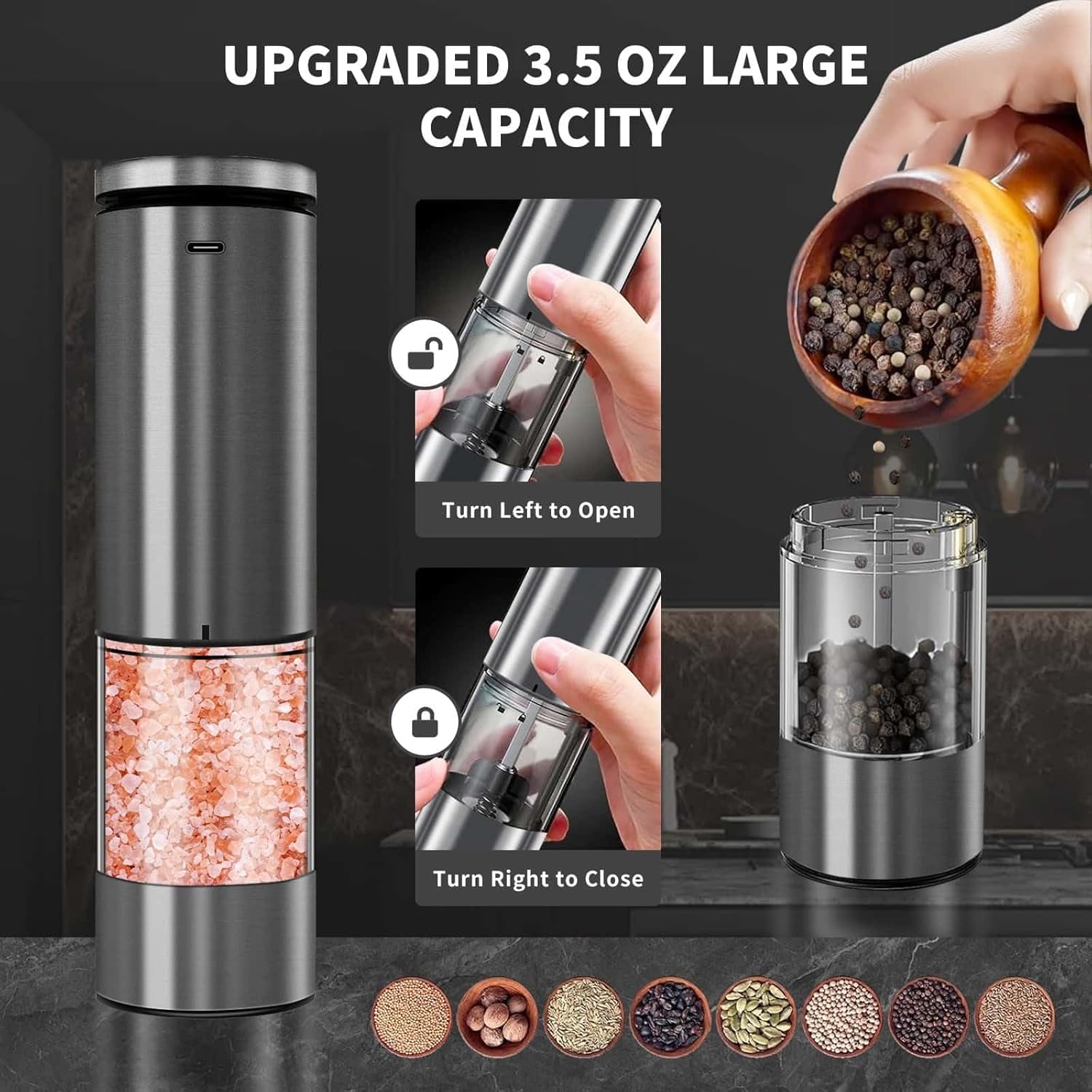 Add a Touch of Elegance to Every Meal: Presenting our enhanced auto salt and pepper grinder set, crafted from premium stainless steel for a sleek and stylish look. Featuring a rustproof ceramic core, these grinders offer a smooth, consistent grind with every use. Bring sophistication to your kitchen and elevate your cooking experience with each effortless twist, turning every dish into a refined masterpieceDesigned for Ease - Enjoy the ultimate convenience with our automatic salt and pepper mill set, built for easy one-handed operation. Simply press a top button to season your food, making it effortless to add flavor and elevate every mealEnhance Your Flavor Journey: Meet our rechargeable salt and pepper grinder set. Let automation do the work for you, relieving strain on your hands and wrists for a smooth, effortless grind. Elevate your meals with the bold flavors of himalayan salt and fresh peppercorns, transforming every dish into a deliciously easy masterpiece(Salt and Pepper are not included)Light up Your Cooking Experience: Our carefully crafted design features a built-in LED light and adjustable coarseness, giving you the perfect grind every time. Easily customize the coarseness to suit your taste, ensuring your dishes are always seasoned to perfection. The bottom cap keeps your kitchen clean and preserves the freshness of your spices, reflecting our dedication to a smooth and enjoyable cooking journeyLight up Your Cooking Experience: Our carefully crafted design features a built-in LED light and adjustable coarseness, giving you the perfect grind every time. Easily customize the coarseness to suit your taste, ensuring your dishes are always seasoned to perfection. The bottom cap keeps your kitchen clean and preserves the freshness of your spices, reflecting our dedication to a smooth and enjoyable cooking journey