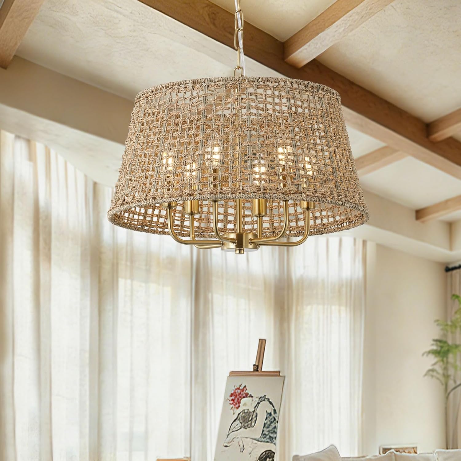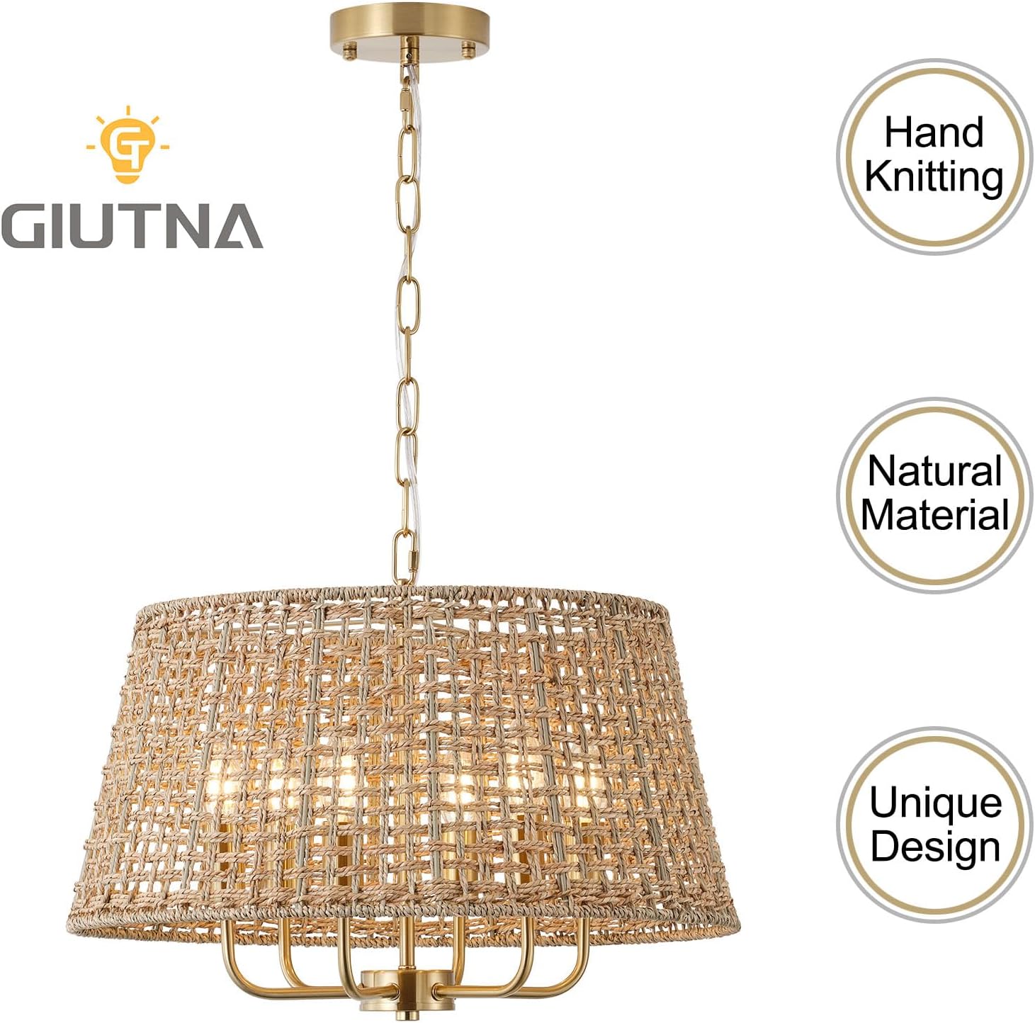 Giutna 20"Rattan Large Boho Chandelier Ceiling Light Fixture, 6-Light Farmhouse Wicker Hand-Woven Chandelier Rattan Ceiling Pendant light Fixture for Dining Room Bedroom Hallway Kitchen Island(Gold)