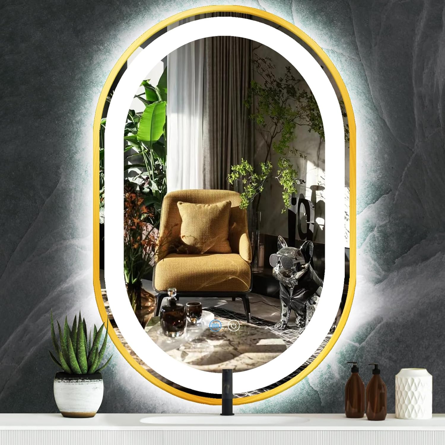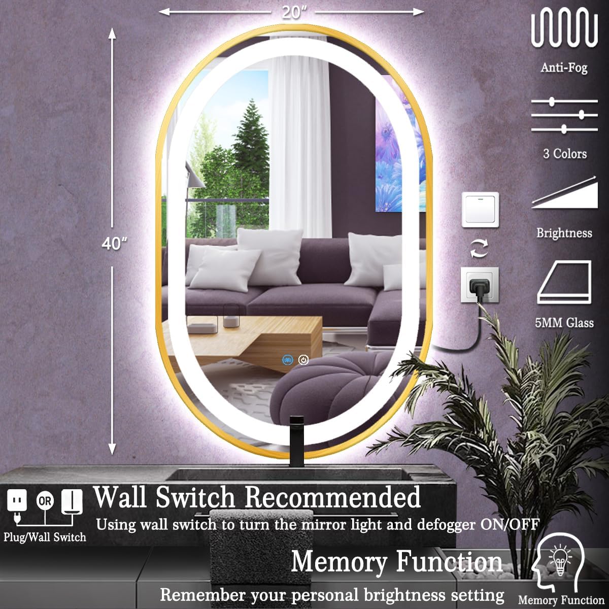 | Additional Features | 3 Color Changing, Dimmable, Fogless, Gold Frame, Touch Sensor |