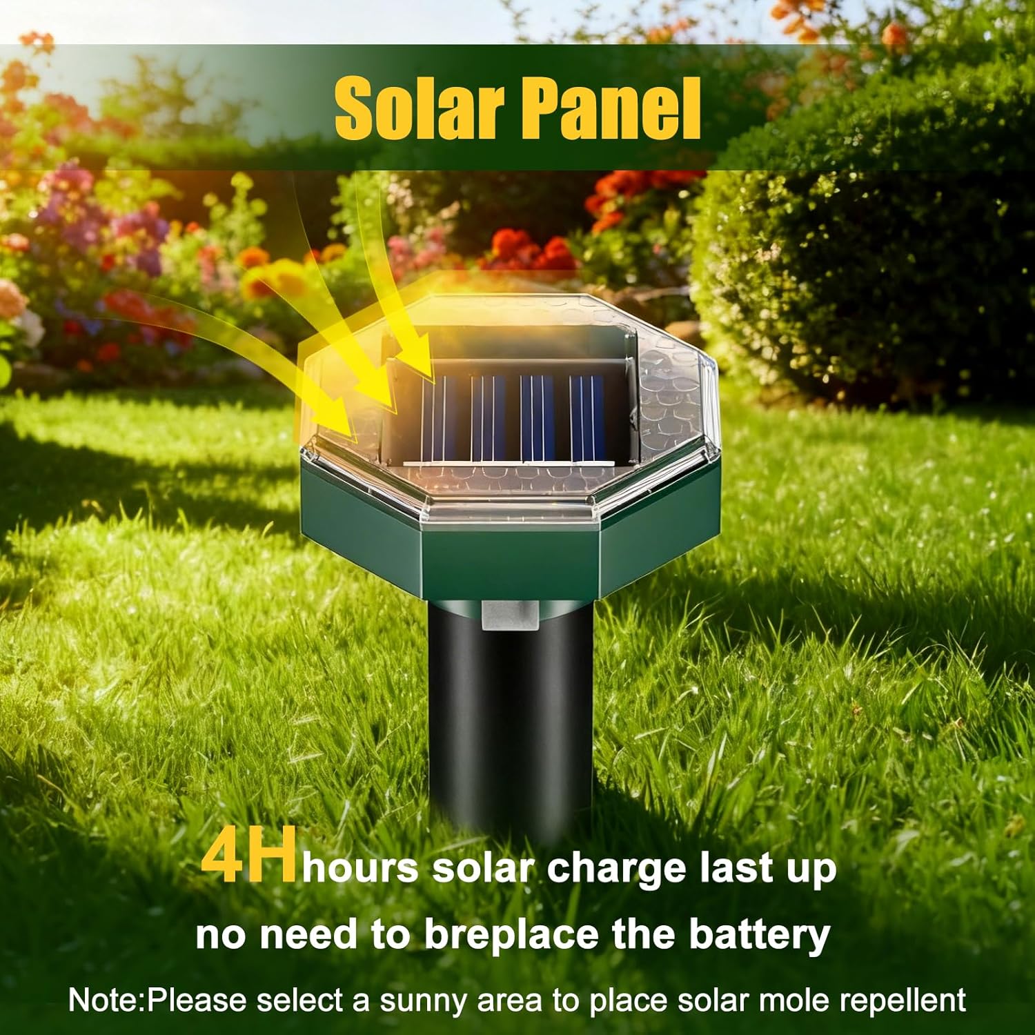 Q1: What animals can this repellent drive away effectively?A: It works perfectly for mole, snake, skunk, rabbit, gopher, raccoon, vole, groundhog and chipmunk, fully meeting the pest repellent needs of yard, lawn and garden.Q2: Is this solar repellent easy to install and use?A: Yes, it has a simple plug-in design, no wiring or battery replacement needed. Just insert it into the soil where there is sufficient sunlight, and it will start working automatically.Q3: What does the IP66 waterproof and dustproof rating mean for this device?A: IP66 means it is 100% dustproof and can withstand high-pressure water spraying from any direction. It can work normally in heavy rain, snow and dusty outdoor environments (not suitable for long-term soaking in water).Q4: How long can it work on rainy or cloudy days without sunlight?A: The 2026 upgraded version is equipped with a high-capacity rechargeable battery. It can store enough solar energy on sunny days and work continuously for 3-5 days in rainy or cloudy weather.Q5: Does the ultrasonic frequency of this repellent hurt pets like dogs and cats?A: No, it emits 20-60KHz ultrasonic waves that only target small harmful animals. The frequency is safe for dogs, cats, birds and other domestic pets, and will not cause any discomfort to them.Q6: What is the effective coverage area of a single repellent?A: A single device has an effective coverage of 800-1000 square feet (about 75-93 square meters). For large yards or gardens, it is recommended to install one every 8-10 meters for full coverage.Q7: Does this repellent need to be charged manually or only by solar energy?A: It is a fully solar-powered design, with a high-efficiency monocrystalline silicon solar panel that charges automatically during the day and works at night. No manual charging or power supply is required at all.Q8: How long does it take to see the obvious repellent effect after installation?A: Most small pests will show avoidance behavior within 3-7 days after installation. For areas with severe pest infestation, the best effect can be achieved after continuous use for 2-3 weeks (pests will completely move away).Q9: Is the material of this repellent durable for outdoor long-term use?A: It is made of high-strength ABS hard plastic, which is anti-UV, anti-freezing and anti-corrosion. It can resist outdoor high temperature, low temperature and various harsh weathers, and has a long service life.Q10: What accessories are included in the 8-pack of this repellent?A: The 8-pack includes 8 solar ultrasonic repellents, 8 ground insertion stakes (strengthened version for firm insertion), and a detailed English user manual, with no additional accessories needed for use.