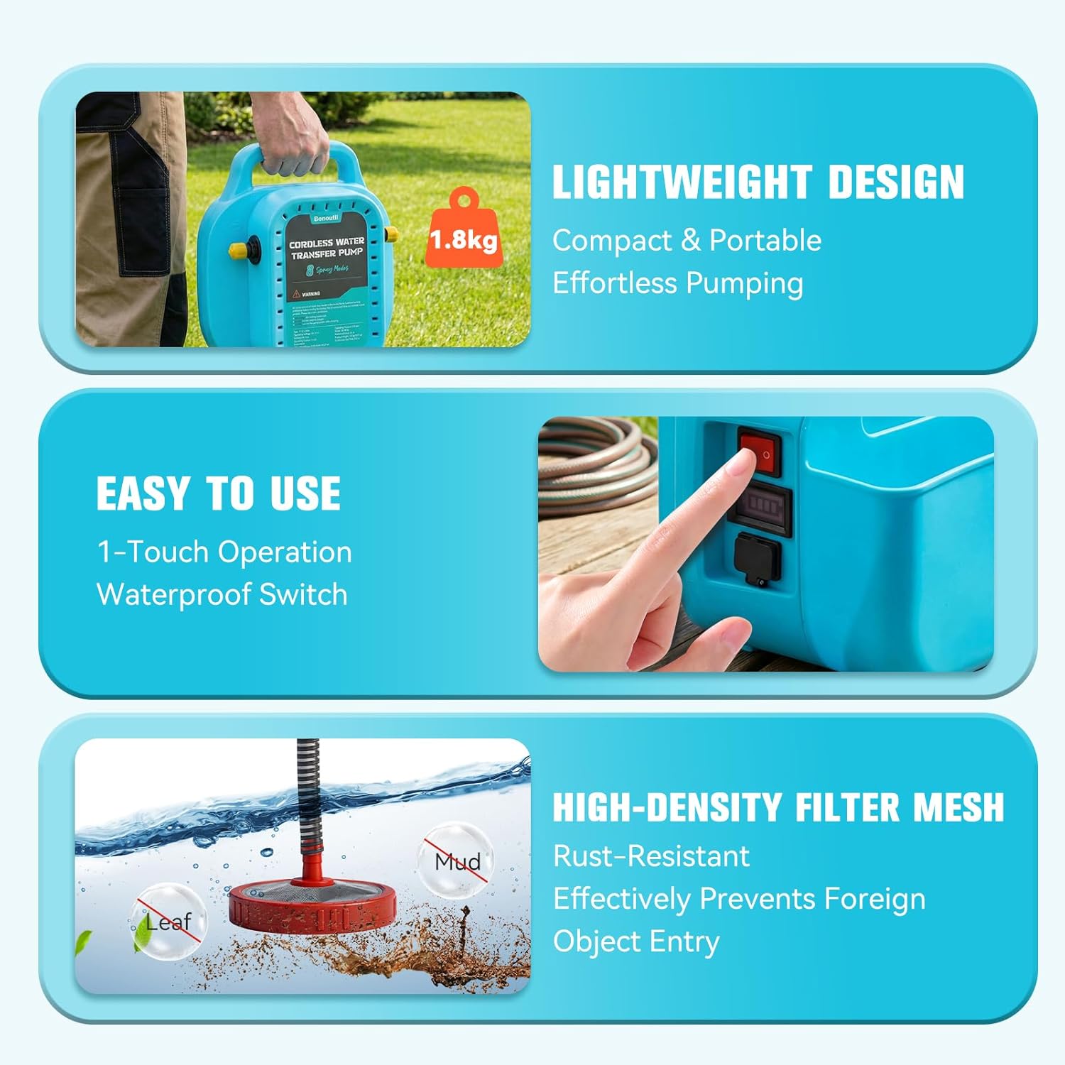 | Included Components | A Pair of Goggles, A Pair of Gloves, Bonoutil 21V Battery Powered Water Pump Cordless, Charger, Inlet Pipe, Outlet Pipe, Quick Connector*4, Sealing Ring*4, Spray Gun, Filter |