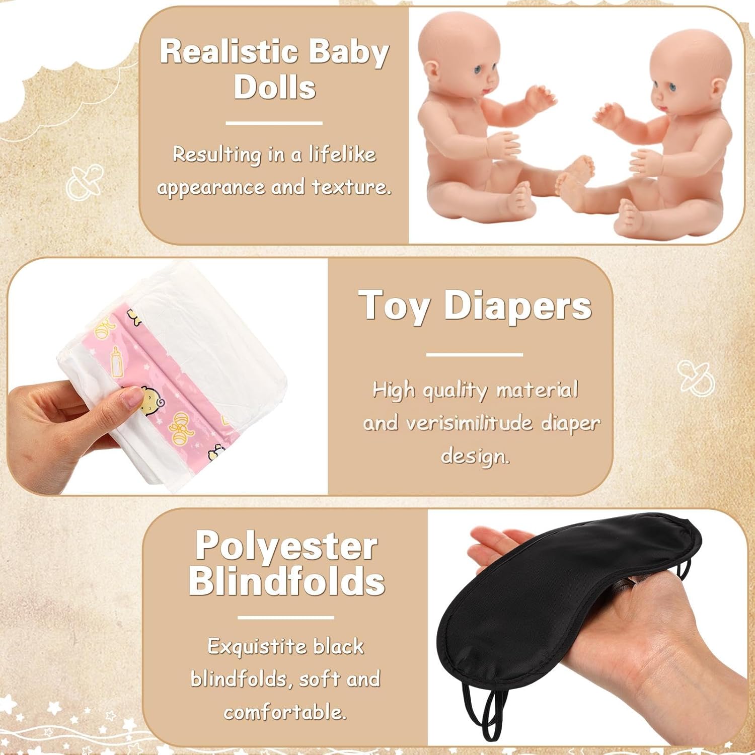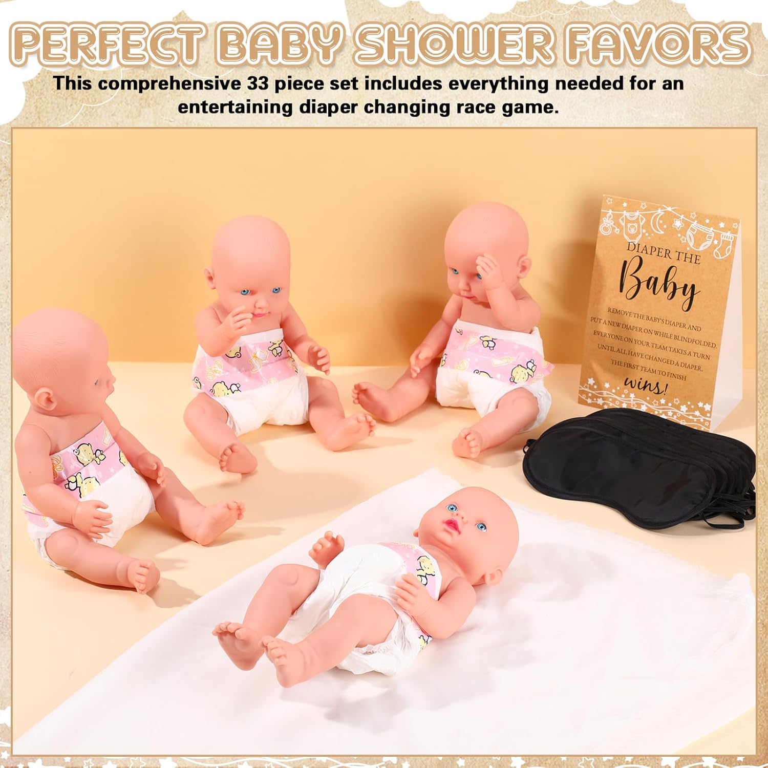 Features: Designed with durability in mind, each component of this 33 pcs set is made to last. The baby dolls crafted through the vinegar process are sturdy and can be reused for future events. The polyester blindfolds resist fraying and tearing, while the rigid cardboard game sign withstands repeated use. This makes the set an eco-conscious option, supporting more sustainable celebrations without compromising on fun. The diaper changing race game is more than just a challenge—it's a hilarious, interactive activity that brings people together. Nice for breaking the ice among guests who may not know each other well, this 33 piece set encourages group bonding through laughter, friendly competition, and shared memories. Whether it's the blindfolded diapering or the race to the finish, everyone leaves with a smile and a story. Number of Items: 33 PCS Material: multicolor Baby Dolls: vinegar process Blindfold: polyester Sign: cardboard Color: Size: 11.8 inch/ 29.97 cm Package includes: 4 x Baby dolls 4 Blindfold 24 Diapers 1 Game Sign Note: Manual measurement may result in slight discrepancies in size. The color may exist a slight difference due to different screen displays.