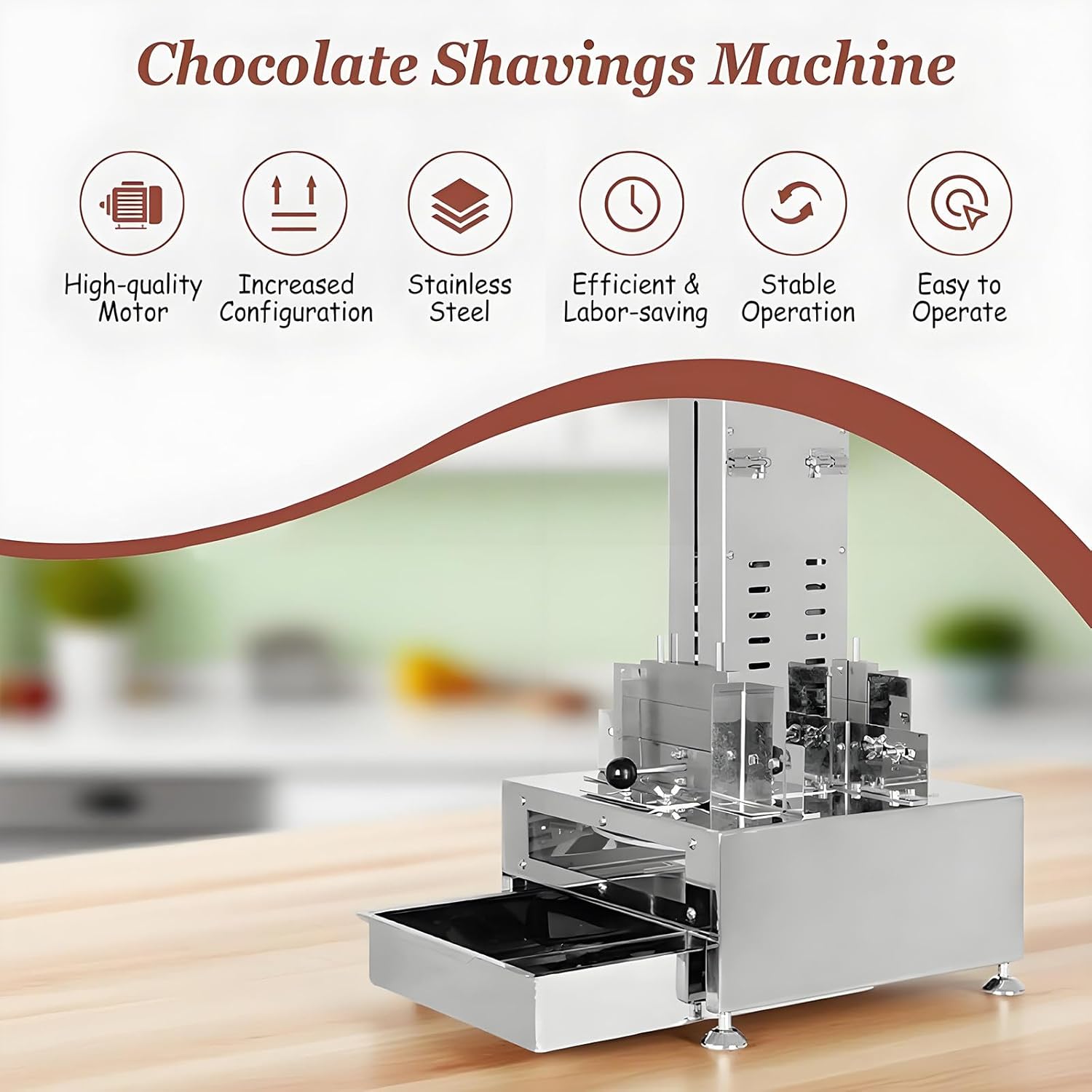 Introducing our Automatic Chocolate Shavings Machine, designed to elevate your dessert presentation with effortless precision. Powered by a robust 120W motor, this machine ensures smooth and consistent slicing of various types of chocolate, making it a must-have for any chocolate shop or bakery. The four razor-sharp blades effortlessly create uniform chocolate curls, shavings, or slices, adding a touch of elegance to your creations.Imagine enhancing your dessert offerings and impressing your customers with visually stunning chocolate decorations. This reliable chocolate shaver not only saves valuable time during busy hours but also allows you to craft exquisite desserts, special occasion cakes, and confections that stand out. Whether you're preparing for a catering event or simply elevating your store’s treats, this machine is an essential tool for any serious pastry chef.Specifications:Power: 120WMaterial: Stainless SteelVoltage: 110V/220VChocolate Size: 215*340MMDimensions: 400*400*600mmWeight: 21kgPacking List:Chocolate Shavings Machine x1Please note: Slight color variations may occur due to lighting during photography, and a manual measurement error of 1-3cm may exist. Elevate your chocolate game today with this essential kitchen appliance!