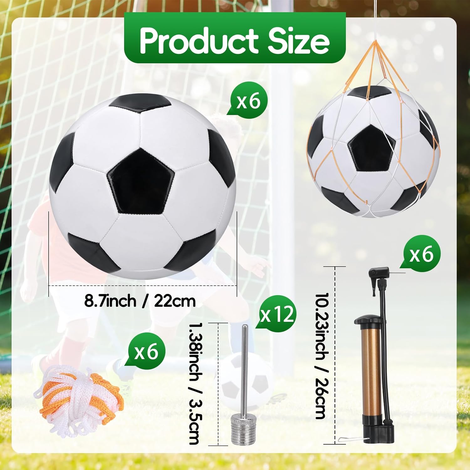 Features: Looking for the practical operation Christmas shoebox gifts? These soccer ball size 5 with pump in bulk makes a nice gift for soccer ball enthusiastic on Christmas, birthday and other occasions, bringing them an exciting game and conveying your love, care and kindness to them. This bulk set is an ideal gift for soccer lovers, teams, or events. Give the joy of sport on birthdays, Christmas, or team celebrations. Each soccer ball and pump set encourages active play and conveys thoughtfulness—ideal for sharing fun with friends, family, or teammates. Specifications: Material: PVC Color: black and white Style: classic Size: size 5 Package includes: 6 x Size 5 Soccer Balls 6 x Pumps 12 x Needles 6 x Mesh Sport Bags