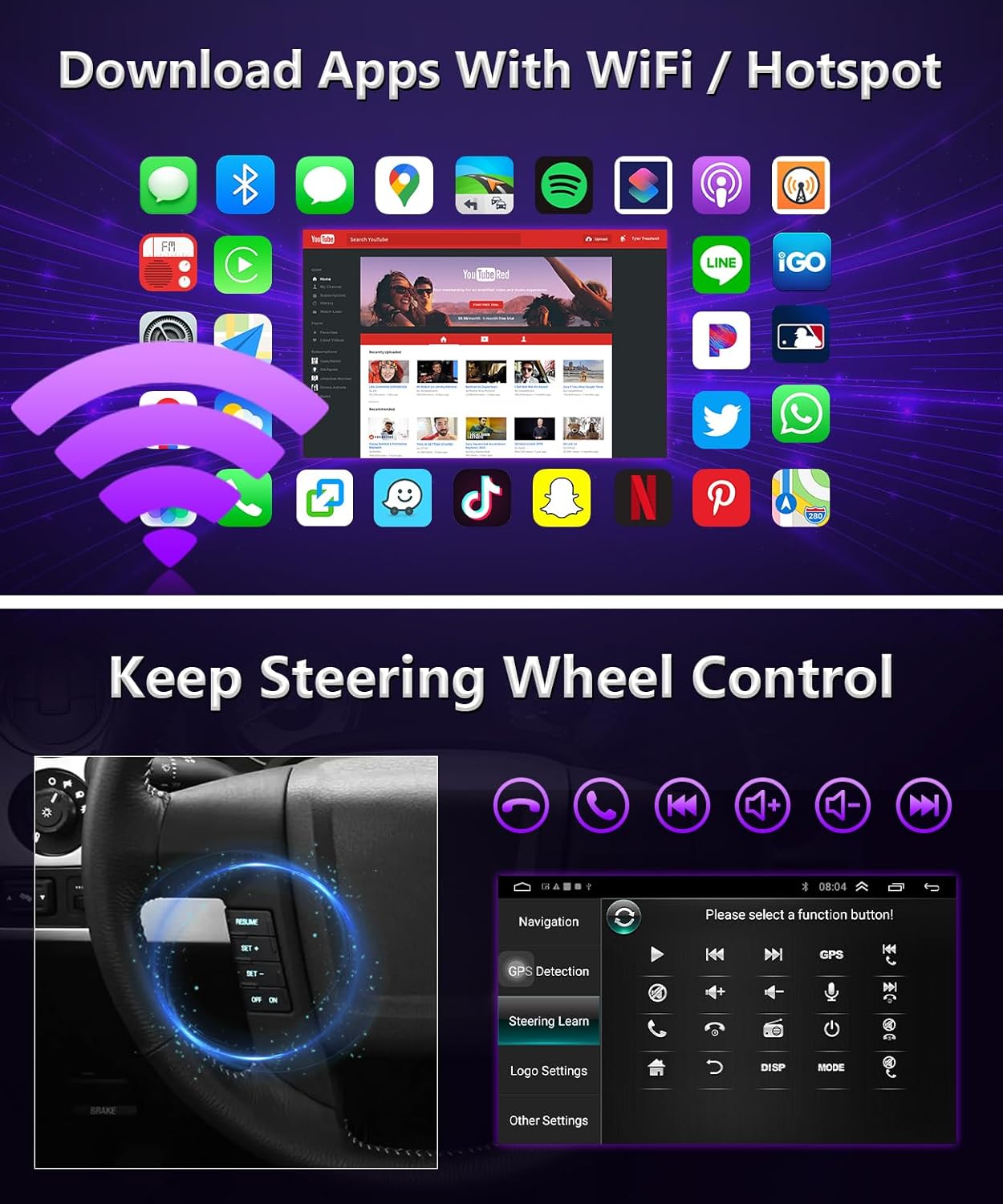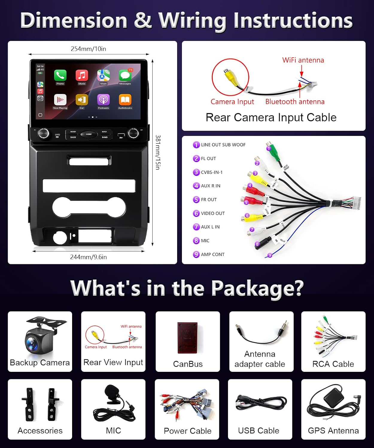 | Additional Features | Audio Input/Output, FM/RSD/DSP Radio, EQ Adjustment,, Lane Assist, Waterproof, Steering Wheel Control, Hands-Free Calling, Voice Control, Split-Screen,, Over 15-Hour road trip tested, No overheat, Plug and play new harness, 100% Brand-new chips,, Wireless/Wired Apple CarPlay, Android Auto, Mirrorlink, |