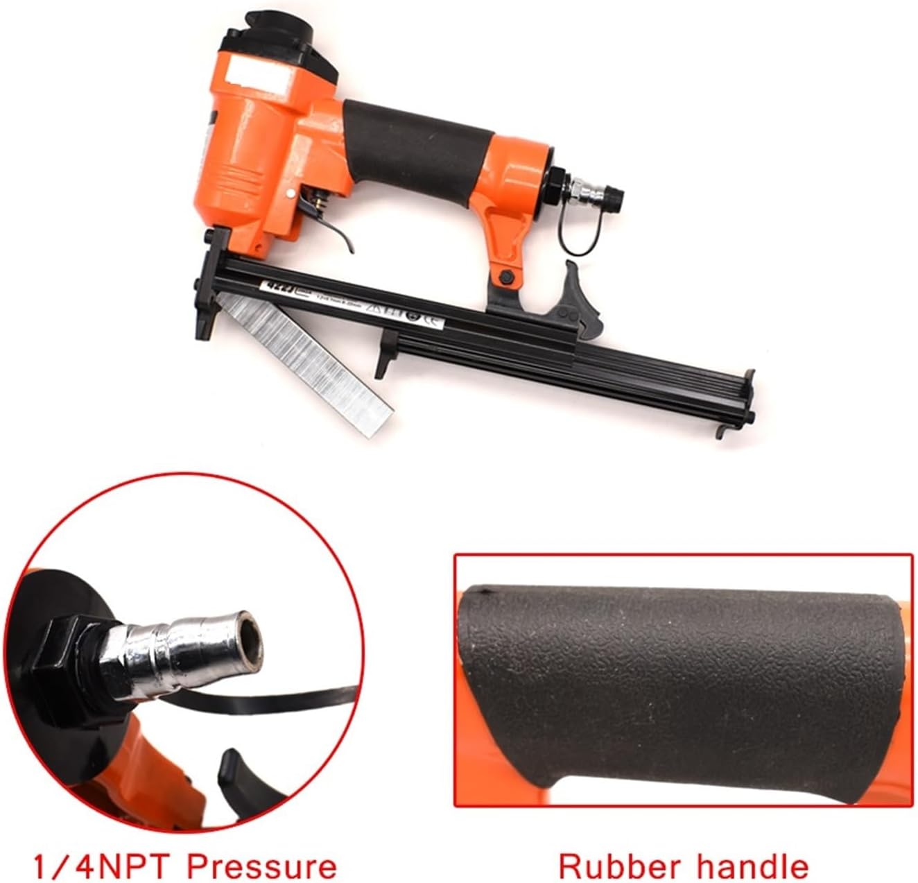 1. By manually turning the depth adjustment wheel, you can change the driving depth of various engineering and material staples.2. Features comfortable grip and 360° adjustable exhaust.3. Easy bottom loading and quick removal of clog release.1. Model of tool :422J2. Air inlet (Optional for thread size):NPT1/4"3. Nail :100pcs4. Nail range :410J,413J,416J,419,422J5. Recommended operating pressure range :3.5-5bar(50-85psi)6. List:422J nail gun*1Hexagonal wrench*2Instruction manual*1422J