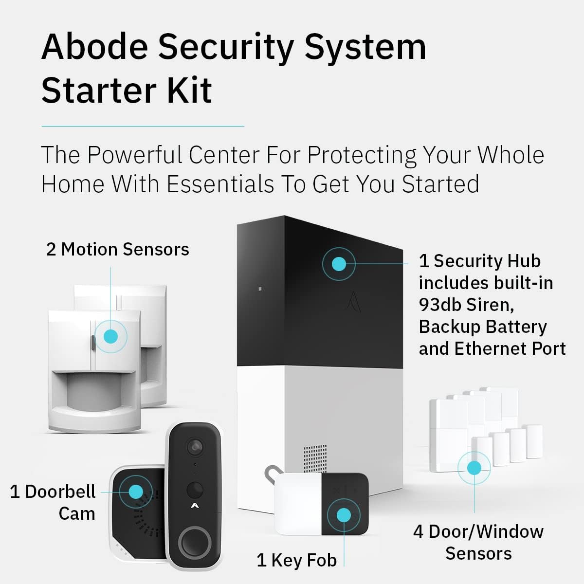 The Abode 9 Piece Wireless Security System Starter Kit is an expandable home security system that is easy to install yourself, and can be integrated with HomeKit, Alexa, and Google Home. Includes 1 Central Security Hub (with a built-in 93dB siren, backup battery, ethernet and connects all your security devices), 1 Abode Key Fob, 2 Abode Motion Sensor, and 4 Abode Door/Window Sensor & 1 Abode Doorbell Camera. In addition to the large ecosystem of Abode products you can add to this system, the Smart Security Hub controls Z-Wave and Zigbee compatible smart accessories like locks, lights and devices with sensors.