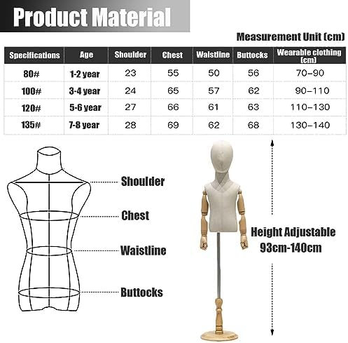 Introducing our Kids Mannequin, designed to elevate your clothing display experience with a combination of quality and versatility. Crafted with a solid wood base, this mannequin ensures stability during use, allowing you to showcase your garments without worry. The adjustable torso height ranges from 93cm to 140cm, making it adaptable for various display scenarios, whether in shop windows, on countertops, or tiered display shelves. Made from durable fiberglass reinforced plastic, the body is complemented by a soft cotton linen cloth head, offering a realistic look for photo shoots, sewing designs, and clothing displays. The mannequin is available in two types: A without arms and B with arms, catering to different display needs. **Size Options:** - **80#**: Shoulder 23cm, Chest 55cm, Waistline 50cm, Buttocks 56cm - Ideal for children aged 1-2 years (Dressing suggestion: 70-90cm). - **100#**: Shoulder 24cm, Chest 65cm, Waistline 57cm, Buttocks 62cm - Suitable for ages 3-4 years (Dressing suggestion: 90-110cm). - **120#**: Shoulder 27cm, Chest 66cm, Waistline 61cm, Buttocks 63cm - Perfect for ages 5-6 years (Dressing suggestion: 110-130cm). - **135#**: Shoulder 28cm, Chest 69cm, Waistline 62cm, Buttocks 68cm - Designed for ages 7-8 years (Dressing suggestion: 130-140cm). **Product Includes:** - A Kids Mannequin torso - Cotton linen cloth head (or plastic arms, depending on the type) - Solid wood base Assembly is a breeze with our easy-to-follow instructions, allowing you to set up or take down the mannequin in minutes without any tools. Please note that while we strive for accuracy, slight measurement variations may occur due to manual measuring. Additionally, color differences may exist due to different display settings. Showcase your creativity and make a lasting impression with our Kids Mannequin, perfect for any clothing display or creative project!