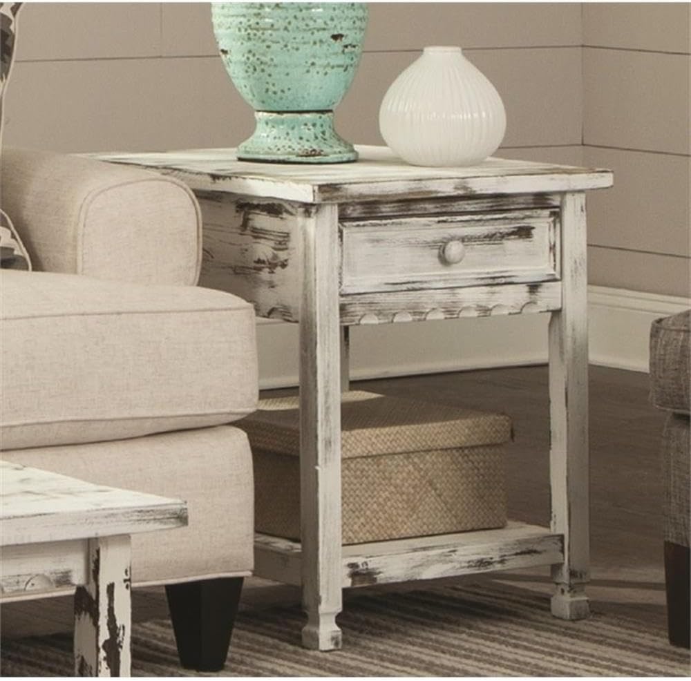 Rustic Cottage Collection will be a charming addition to your home's décor. With its detailed dental work, square legs and select hardwoods (Pine/Acacia) with composite wood construction each piece will be a unique accent in your living space. End table with drawer and shelf allows you to store remotes and other items you need close at hand.