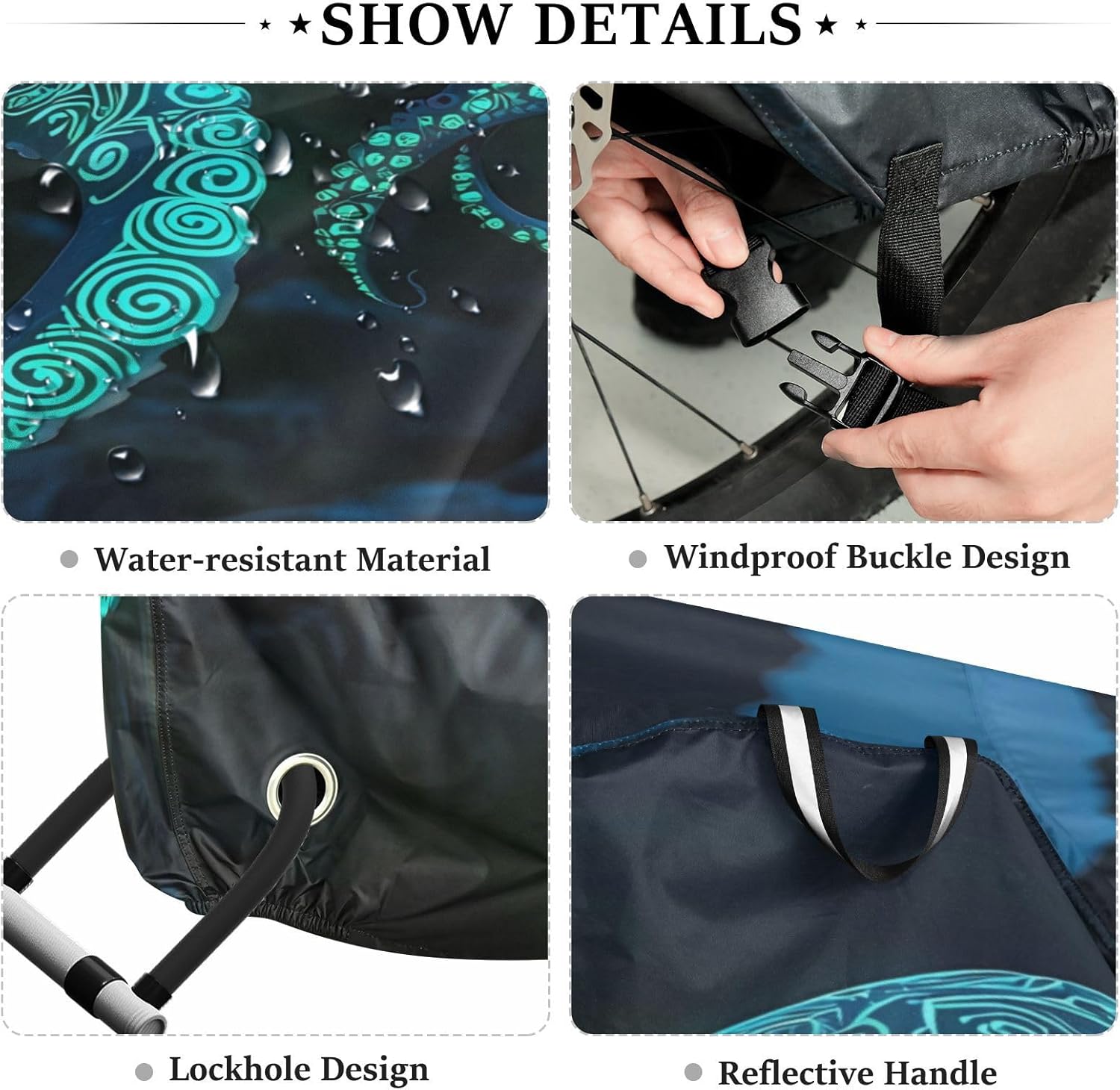 Protect your bicycle in style with our premium bike tarp, engineered for maximum defense against harsh elements. Unlike basic covers, we use specially engineered umbrella waterproof fabric - the same advanced material used in high-end rain umbrellas - delivering superior performance with unique visual appeal. Sun & Heat Defense Our fabric creates a physical cooling barrier that actively lowers your bike's temperature by: Blocking 95%+ harmful UV rays to prevent paint fading Providing exceptional shading & heat insulation (up to 20℉/11℃ reduction vs direct sun) Offering SPF 50+ equivalent protection for sensitive components Rain & Dust Protection Water-repellent coating causes rain to bead and roll off Tightly woven fabric acts as dustproof barrier for long-term storage Prevents moisture buildup with breathable side panels (prevents condensation) User-Focused Design LOCK ACCESS HOLE at front wheel enables secure locking without removing cover ADJUSTABLE BUCKLE STRAP at rear wheel anchors cover during strong winds Reflective safety strips on handles enhance nighttime visibility Ultra-lightweight (23 oz) folds into included pouch Unbeatable Aesthetics Choose from over 1,000 designer patterns - from sleek geometrics to vibrant nature motifs - transforming your bike into a street-style statement while competitors offer only solid colors.