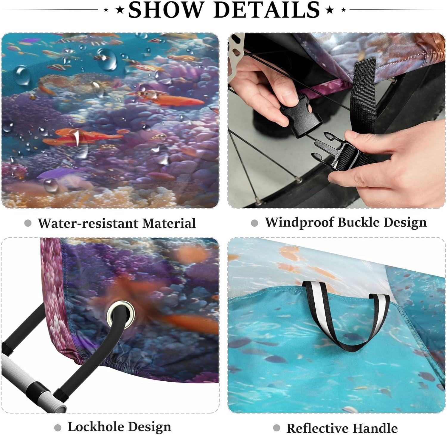 Protect your bicycle in style with our premium bike tarp, engineered for maximum defense against harsh elements. Unlike basic covers, we use specially engineered umbrella waterproof fabric - the same advanced material used in high-end rain umbrellas - delivering superior performance with unique visual appeal. Sun & Heat Defense Our fabric creates a physical cooling barrier that actively lowers your bike's temperature by: Blocking 95%+ harmful UV rays to prevent paint fading Providing exceptional shading & heat insulation (up to 20℉/11℃ reduction vs direct sun) Offering SPF 50+ equivalent protection for sensitive components Rain & Dust Protection Water-repellent coating causes rain to bead and roll off Tightly woven fabric acts as dustproof barrier for long-term storage Prevents moisture buildup with breathable side panels (prevents condensation) User-Focused Design LOCK ACCESS HOLE at front wheel enables secure locking without removing cover ADJUSTABLE BUCKLE STRAP at rear wheel anchors cover during strong winds Reflective safety strips on handles enhance nighttime visibility Ultra-lightweight (23 oz) folds into included pouch Unbeatable Aesthetics Choose from over 1,000 designer patterns - from sleek geometrics to vibrant nature motifs - transforming your bike into a street-style statement while competitors offer only solid colors.