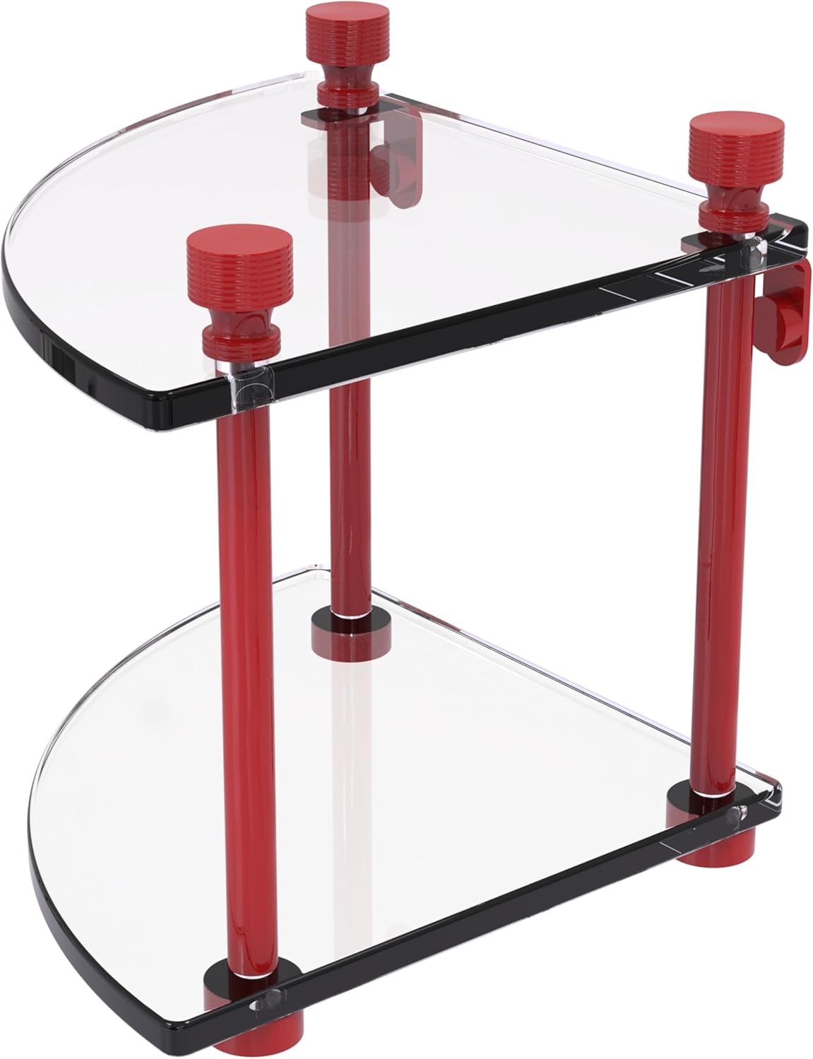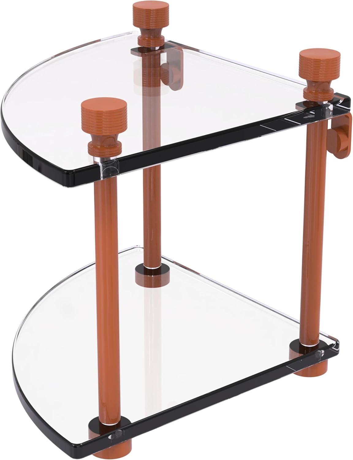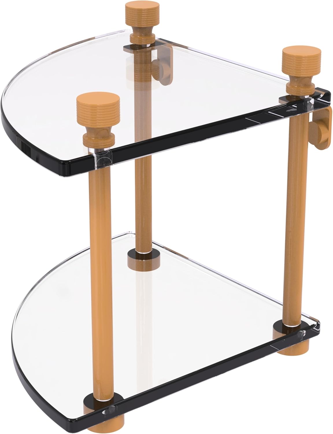 Product Description Add space and organization to your bathroom with this simple, contemporary design 2-tier glass vanity corner shelf. Featuring tempered, beveled-edged glass and solid brass hardware this shelving unit is crafted for durability, strength and style. One of the many coordinating accessories in the Allied Brass collection of products, this subtle glass shelf unit is the perfect complement to your bathroom decor. From the Manufacturer Since the beginning of the organization, it has been our passion to deliver the world class kitchen and bathing solutions for satisfaction of our clients. A one stop solution article for Houses, Hotels, Departmental Stores and all bathing needs. These corner glass shelves have smooth edges, corrosion resistance, long sustainability and keep your articles arranged Systematically.