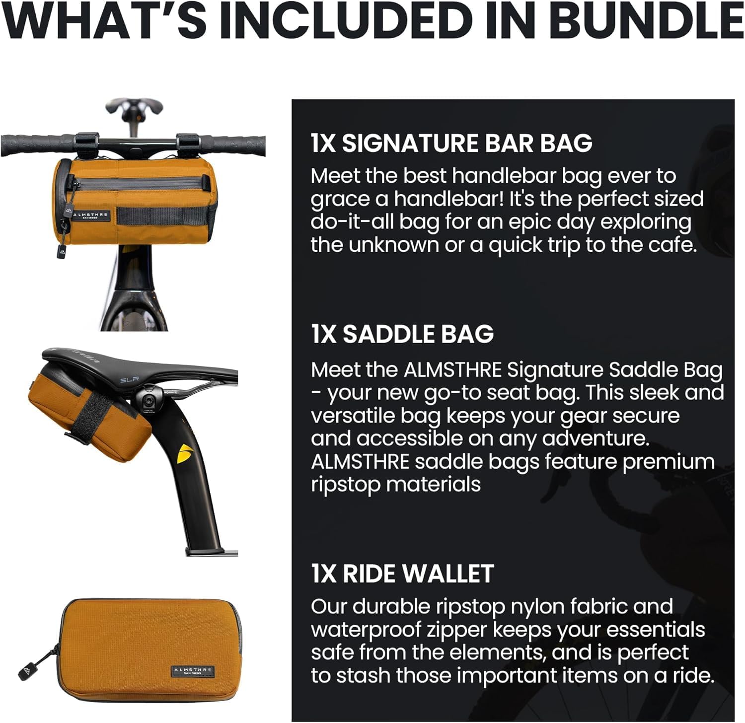At ALMSTHRE, we believe in curiosity, community, and the art of escape. Our gear is built for those who never stop exploring — for riders chasing what’s around the next corner. This bundle is made for that journey. The ALMSTHRE Signature Bar Bag Bundle (Gold) includes three essentials designed to perform: our signature bike handlebar bag, bike seat bag, and biker wallet. The bicycle bar bag is the perfect do-it-all bag for an epic day exploring the unknown or a quick trip to the café. Measuring 5 inches in diameter and 7.5 inches long, it holds 2.4 liters. Our signature hard shell design retains its shape no matter what’s inside. It features a quick-access side zipper, enlarged side pocket, internal mesh organizer, and multiple mounting options to fit your handlebars. The bicycle saddle bag keeps your gear secure and accessible. Sized at 3 inches wide, 5.25 inches long, and 2 inches tall, it offers 0.5 liters of storage and weighs just 58 grams. It’s large enough to carry two tubes and two CO2 cartridges—or just your ride essentials. Made from premium ripstop material, it includes reinforced wear points, an internal pocket, a high-visibility liner, a waterproof zipper, and a secure single seat rail strap. The bike pouch offers three internal organizer pockets and is 7 inches long by 4 inches wide, making it big enough to fit most phones. It’s made from ripstop nylon with a waterproof zipper to keep your essentials safe. Tuck away your ID, credit cards, and cash, and ride worry-free. Whether you're packing light or bringing it all, this bundle is made to move with you—wherever the ride leads.