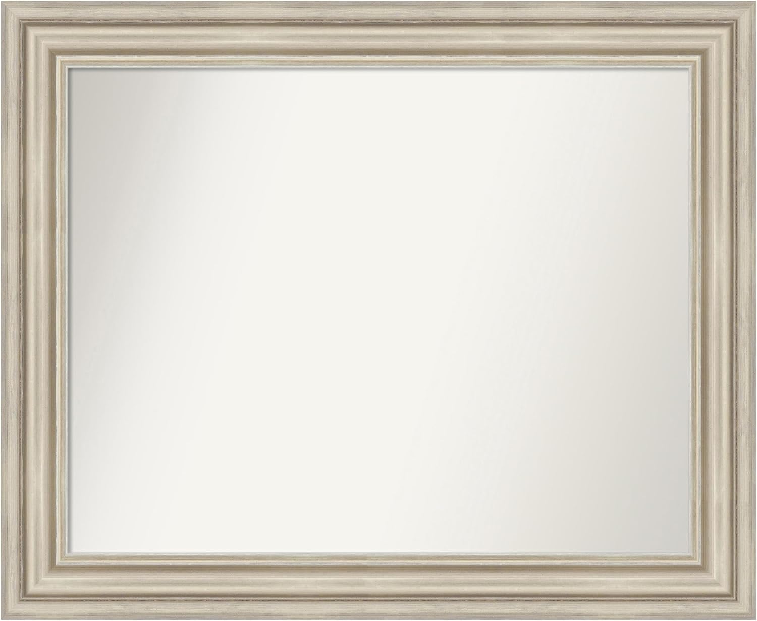 PRODUCT: Amanti Art Non-Beveled Wood Bathroom Wall Mirror; OUTER SIZE: Exactly 33.5 x 27.5 inches; FRAME: Sierra Black Brown; FRAME FINISH: Satin; FRAME COLOR: Black. The Sierra Black Brown frame is a contemporary, scooped, black frame with a dramatically raised outer edge and a satin finish that has faint lines and mild distressing throughout. The inner edge is gold and the outer edge is a dark espresso. Give your bathroom the finishing touch with this 100% real wood-framed wall mirror. Individually made using traditional custom framing techniques, it has the quality you would expect from your local frame shop. It holds its value with premium finishing that can be appreciated up close. Because of our attention to detail and focus on artistry, architects, interior designers, and homeowners alike choose this mirror to create beautiful living spaces.