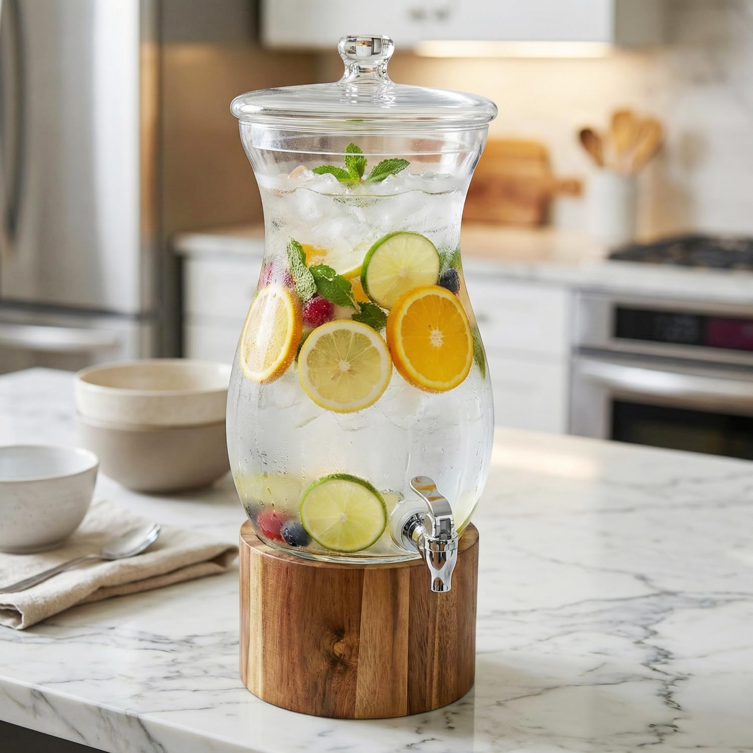 Enjoy this beverage dispenser from American Atelier. It is made of glass with a wood base and has a 1.5 gallon capacity. This set coordinates with other Madera serving pieces. Great for indoor and outdoor parties and gatherings.