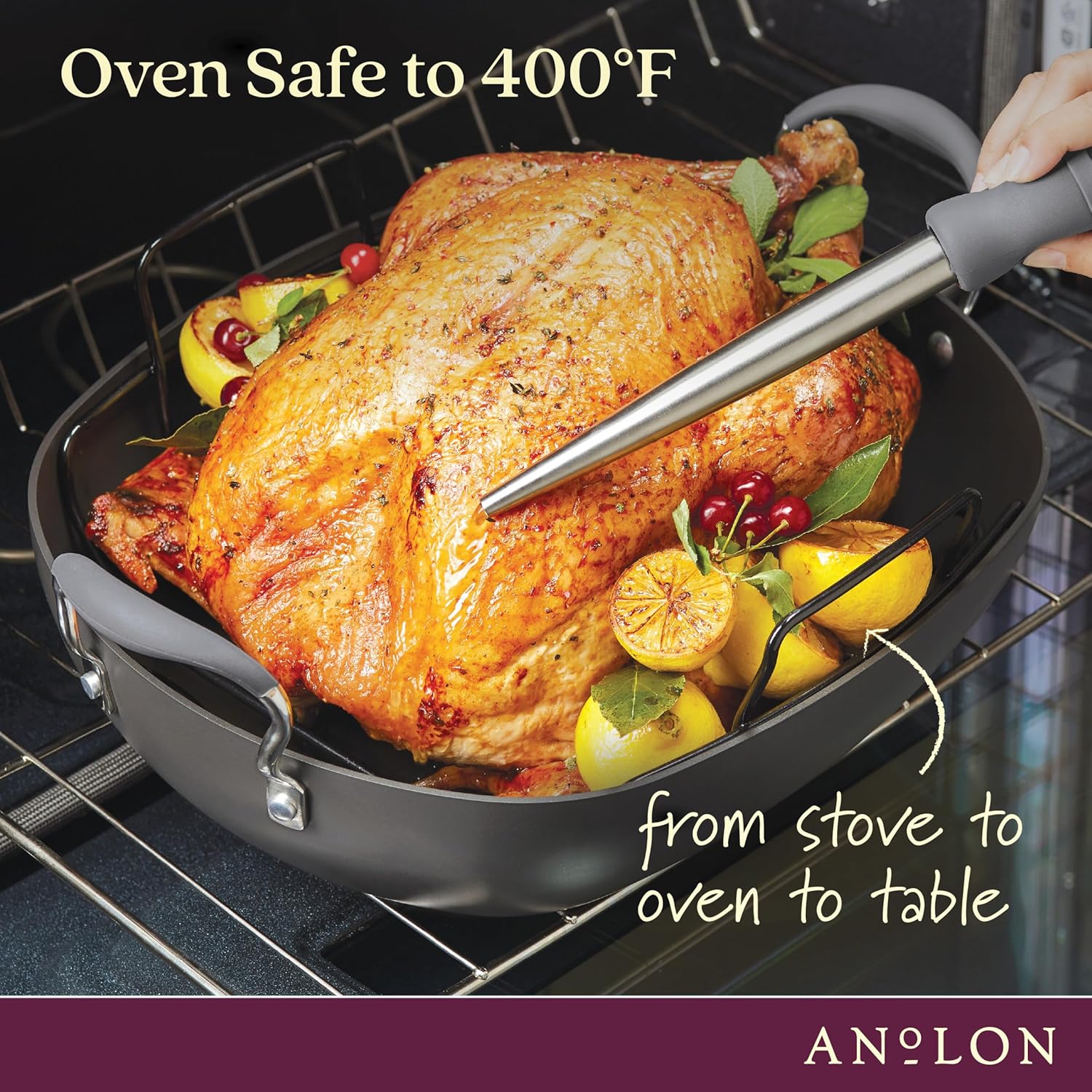 Your first step to sublime roasting starts here. Anolon Advanced provides dependability and versatility with one of the very best nonsticks on the market. Step up to a carefully crafted holiday essential designed to outperform, outlast, and outshine your current roasting pan. Engineered for fast, uniform heating, this hard-anodized roaster with removable dishwasher safe wire rack is twice as hard as stainless steel for durability that lasts. The turkey pan and roasting set is oven safe to 400°F, and the large oven pan holds a 16-pound turkey or roast and features one of the longest lasting and smoothest-gliding cookware surfaces you can buy. If you expect more from your nonstick, welcome to the sublime roasting experience of Anolon Advanced.