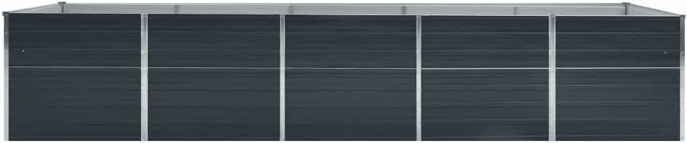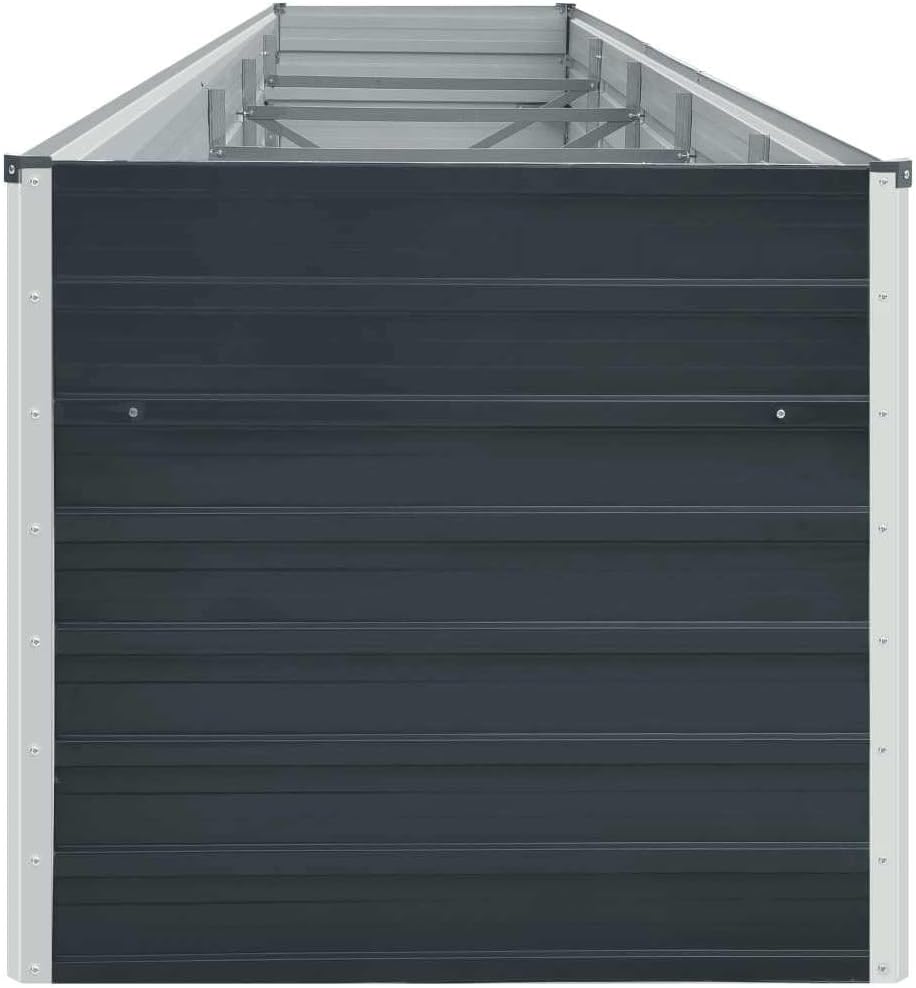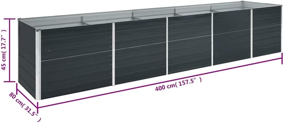 This galvanized steel garden raised bed planter is a brilliant addition to any outdoor space, combining practicality with good looks. With a stylish anthracite finish and minimalist vibe, it fits in perfectly with various garden styles, making your balcony or garden area look great while serving a practical purpose.Durable Construction: Built from high-quality galvanized steel, this raised bed provides excellent durability and longevity. It resists rust and corrosion, making it weather-resistant year-round.Spacious Dimensions: Measuring 157.5 in x 31.5 in x 17.7 in, it offers loads of room for a variety of plants, making it perfect for growing veggies, herbs, or flowers.Weather Resistant: Built to withstand heat and UV exposure, this planter keeps its shape and looks good even in rough weather, keeping your plants safe from sun and extreme temperatures.Minimalist Design: The non-reflective matte finish gives it a cool look that fits right into any garden style. Its rectangular shape provides a modern touch while maximizing growing space.Easy Maintenance: With simple care—just wipe down with warm water and steer clear of harsh chemicals—this planter makes gardening a breeze for everyone.Color: Anthracite Shape: RectangularMaterial: Metal SteelFinish: Matte Indoor/Outdoor: Outdoor OnlyRoom: Garden and terraceCapacity: Big enough for loads of plantsMaximum Volume: 19130.4 ft³Dimensions: 157.5 x 157.5 x 17.7 in (W x L x H)Weight: 27.91 lbsDrainage: YesDelivery Contains: Raised bed partsAssembly Required: YesRecommended Number of People for Assembly: 1