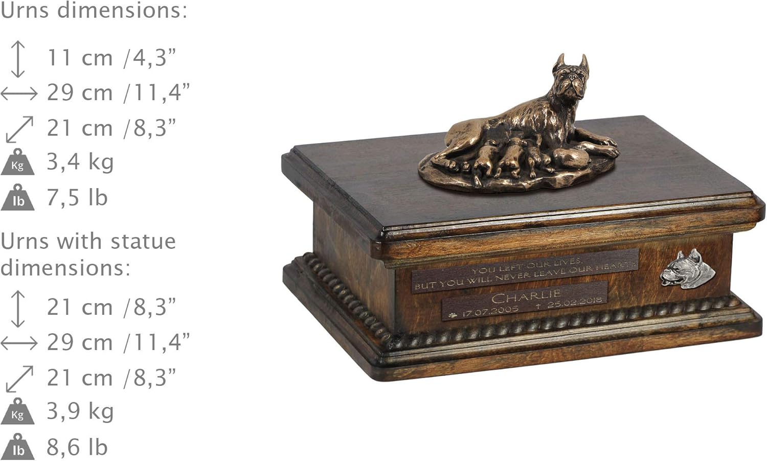Handmade with precision and care, this cremation box combines artistry with functionality to create a unique and lasting tribute. The Cold Cast Bronze Dog statue, intricately detailed, becomes a focal point of this urn, capturing the spirit and essence of your furry companion. Crafted from durable birch wood, the urn makes for a secure and enduring final resting place. The wooden material adds a touch of warmth and natural beauty, making it a fitting tribute to your pet's memory. Customization is at the core of our Art-Dog Collection, offering a diverse range of statues representing any breed. This allows you to create a personalized memorial that truly reflects the unique qualities of your beloved pet. The wreath-shaped decorations further enhance the urn's aesthetic appeal, adding a subtle yet elegant charm to the overall design. Practicality meets style with the convenient removable lid, ensuring an easy and respectful process for placing your pet's ashes. The urn's dimensions, measuring 21 x 29 x 11 cm, strike a balance between ample space for ashes and a compact size that fits seamlessly into your home. More than just a container, this exclusive Dog Urn by Art-Dog is a meaningful work of art, radiating style and elegance. It stands as a testament to the enduring love and companionship you shared with your pet, creating a memorial that will forever honor their memory.