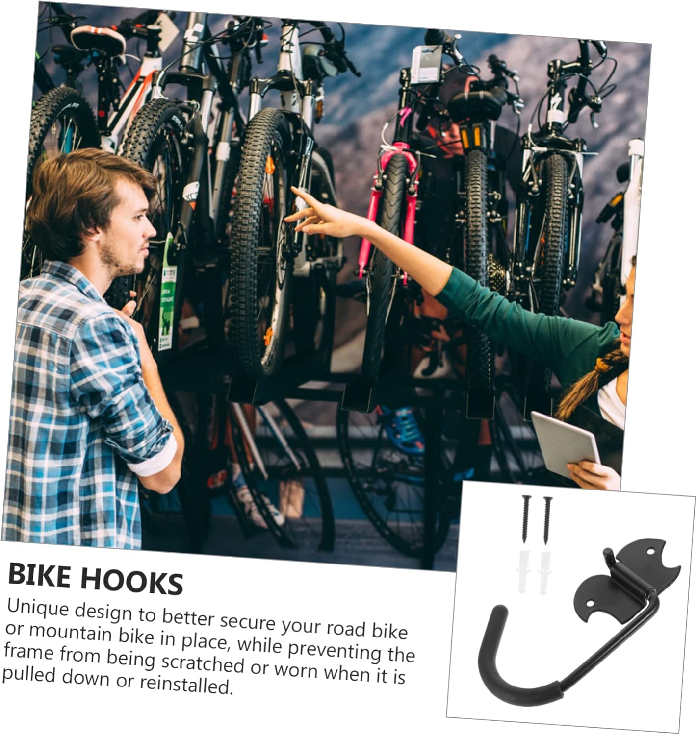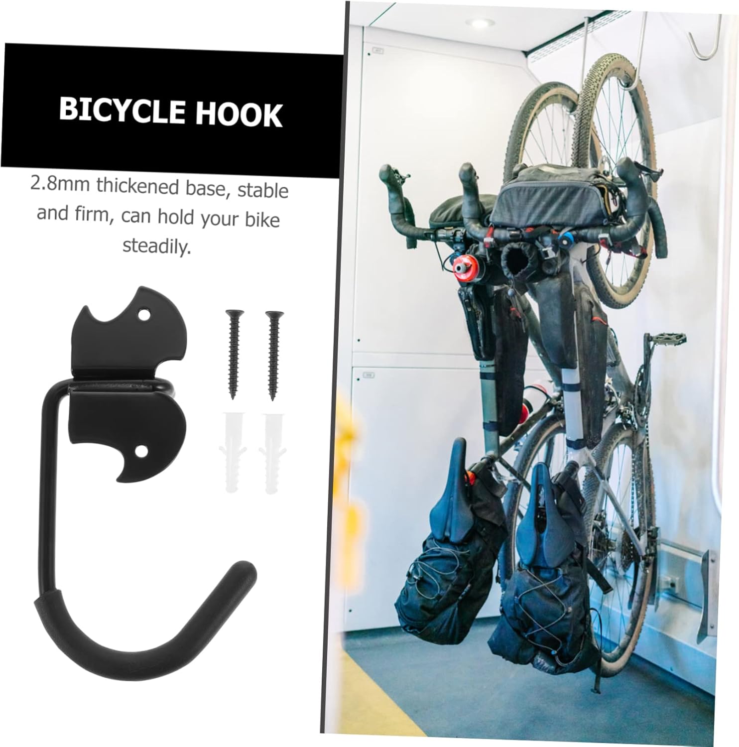 Package List 4 x bike hooks Characteristics Bearing: about 15kg wall hooks -Color:Black hooks for hanging heavy duty -Size:18.00X11.00X2.00cm;/7.07X4.32X0.79in; bike hanger -Material:Steel, rubber, copper paint utility hooks - workmanship, reasonable structure, professional and practical, can bring you convenience bike hangers for garage. - Unique better secure your road bike or mountain bike in place, while preventing the frame from being scratched or worn when it is pulled down or reinstalled bike rack garage. - The bearing capacity is about 15kg, it is suitable for most bicycles bike wall mount. - Painted surface to prevent rust. Rubber wrap, will not damage your bike garage hooks. - 2.8mm thickened base, stable and firm, can hold your bike steadily Storage Utility Hook.Goods Informationladder hooks Designed for bike hanging, this hook can utilize wall space to hold your bike.bike wall mount Also can be a for your friends, they will like it.bicycle hook Made of for long time and durable use.bike hangers for garage It has a simple design, but very practical in use, giving you a