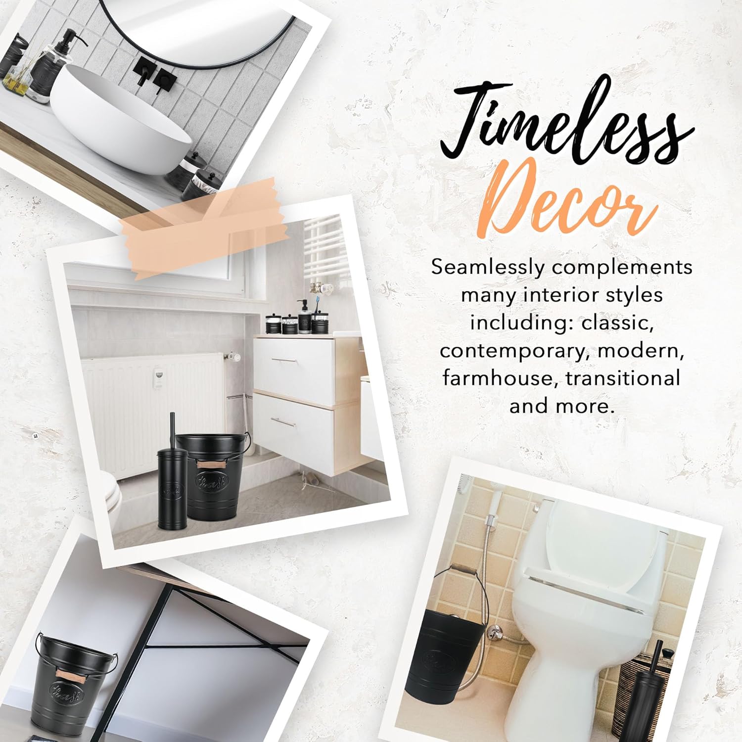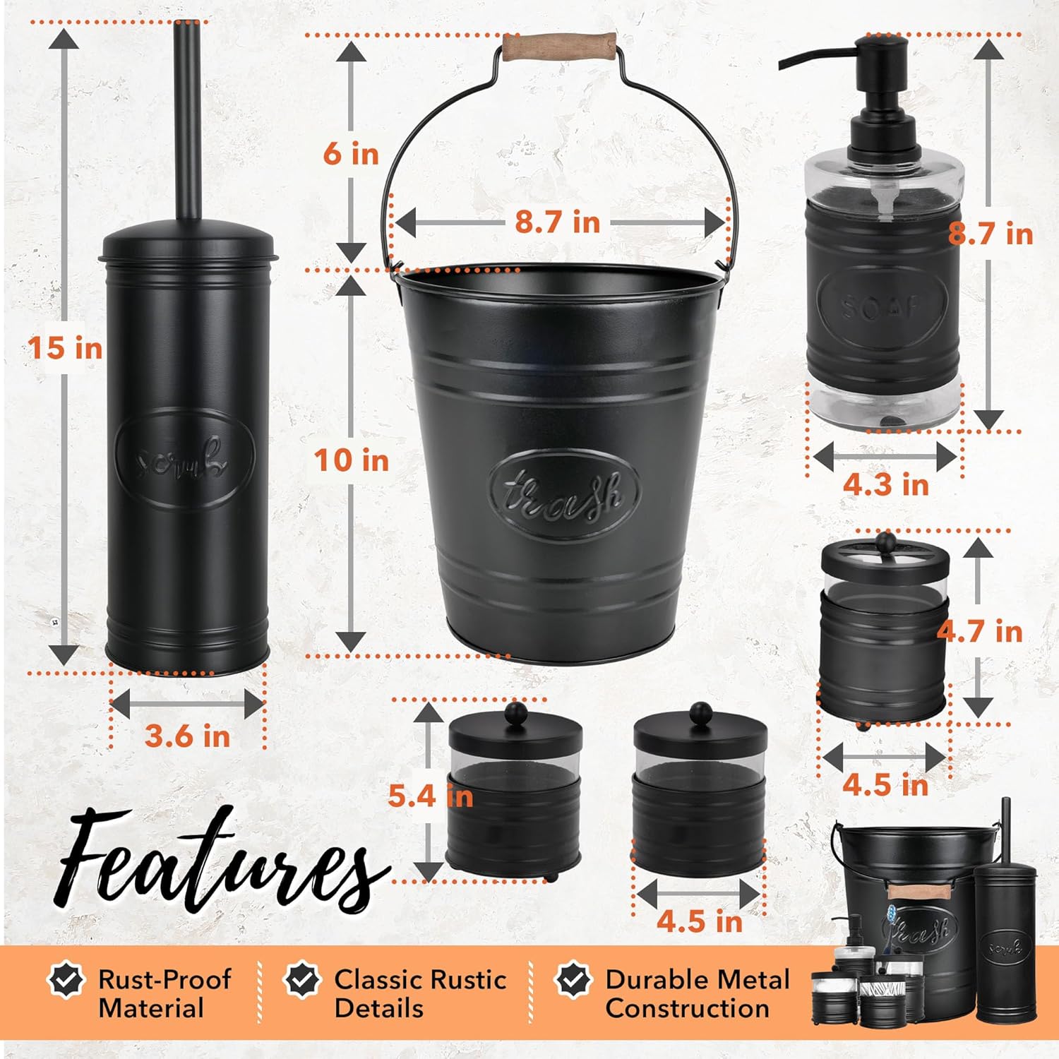 | Included Components | Black trash can, toilet brush with holder, liquid soap dispenser, toothbrush holder, and two glass apothecary jars |