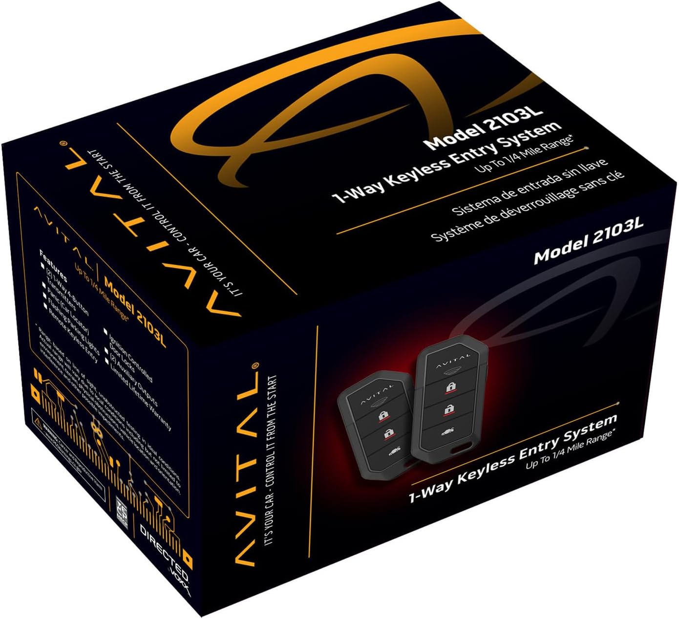 Add the convenience of keyless entry to virtually any vehicle - even vehicles without power door locks! The Avital(R) 2103L 1-Way Keyless Entry System with 2 Remotes offers a wide variety of convenience features. You can lock, unlock, and activate the horn and lights in its Panic mode. There's also an aux output for additional, optional functions such as trunk release. Included in this car keyless entry kit is a pair of 4-button 1-way remotes. Avital(R) - it's your car. Control it from the start. Please note this product is intended for installation by a professional installer only. Attempts to install this product by a person other than a trained professional may result in severe damage to a vehicle's electrical system and components.