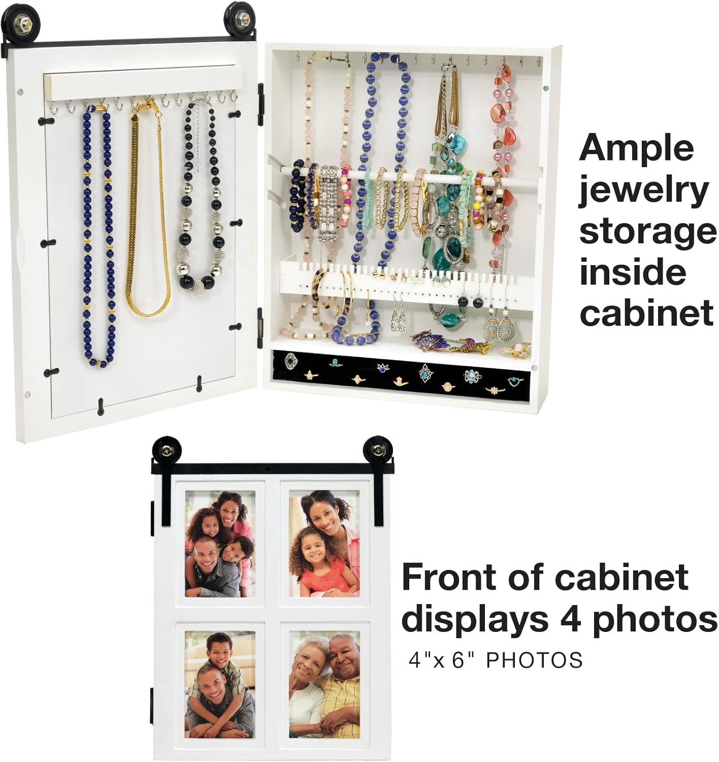 The Excello Global Barndoor Picture Frame Jewelry Organizer - Holds Four 4x6" PhotosThis barndoor picture frame jewelry holder is the perfect addition to any bathroom, bedroom, or vanity. This jewelry organizer features hooks for necklaces, and adjustable dowel for bracelets, notches for earrings, and slots for rings! The front door of this barndoor jewelry cabinet holds four 4 x 6 photographs, a great way to display your favorite photos! This barndoor picture frame jewelry cabinet comes ready to hang with pre-installed mounting brackets.SIZELength: 12.5 inchesWidth: 4 inchesHeight 17.25 inchesFRAME SIZE4 x 6 inches