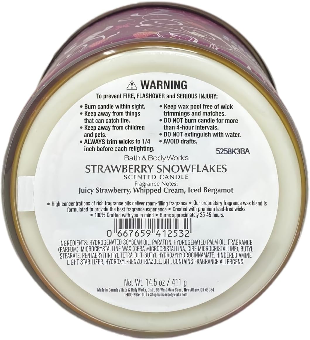 Bath & Body Works Strawberry Snowflakes 2 Piece 3-Wick Scented Candle Set with a Cherry On Top Bar Soap (Ingredients: Saponified Oils of: Olive Oil, Organic Virgin Coconut Oil, Shea Butter, Castor Oil, Vitamin E, Mica, Sodium Lactate, Titanium Dioxide, Fragrance, Kaolin Clay, Cranberry Seeds).