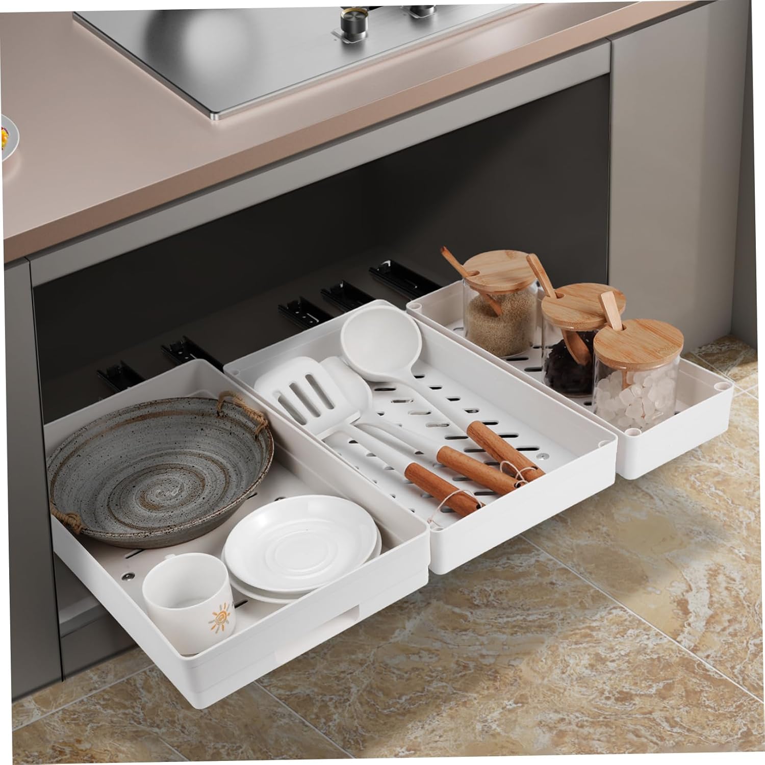 Package Include 3 x pull out rack Characteristics -Multi-purpose Use: Ideal for bedrooms, kitchens, bathrooms, and other areas, pull out shelf offers versatile storage for any space under-shelf baskets -Size:41.50X25.00X6.00cm/16.31X9.82X2.36in kitchen countertop pull-out organizer -Easy Installation: the kitchen pullout drawer can be easily installed with adhesive or screws, ensuring a secure setup without drilling pull out cabinet organiser -Robust and Washable: Built with a sturdy structure and a simple draining design, the pull out pantry organizer is pull out cabinet organizer -Easy : The pull-out pantry organizer allows for convenient use in deep cabinets, making item retrieval effortless pull out pantry shelves -Ample Storage Space: pull out kitchen storage comes in various sizes, providing plenty of room for different kitchen items kitchen storage organizer -Color:White pull out kitchen storage -Material:Plastic pull out shelf hardwareGoods Descriptionstovetop spice shelf Enhance your kitchen storage with this versatile pull-out pantry organizer.pull out kitchen cabinet organizer The sturdy construction allows durability, while the pull-out feature allows for quick access to all your essentials.deep drawer organiser Designed to fit seamlessly into your existing cabinetry, it provides ample space for storing , canned foods, and other pantry items