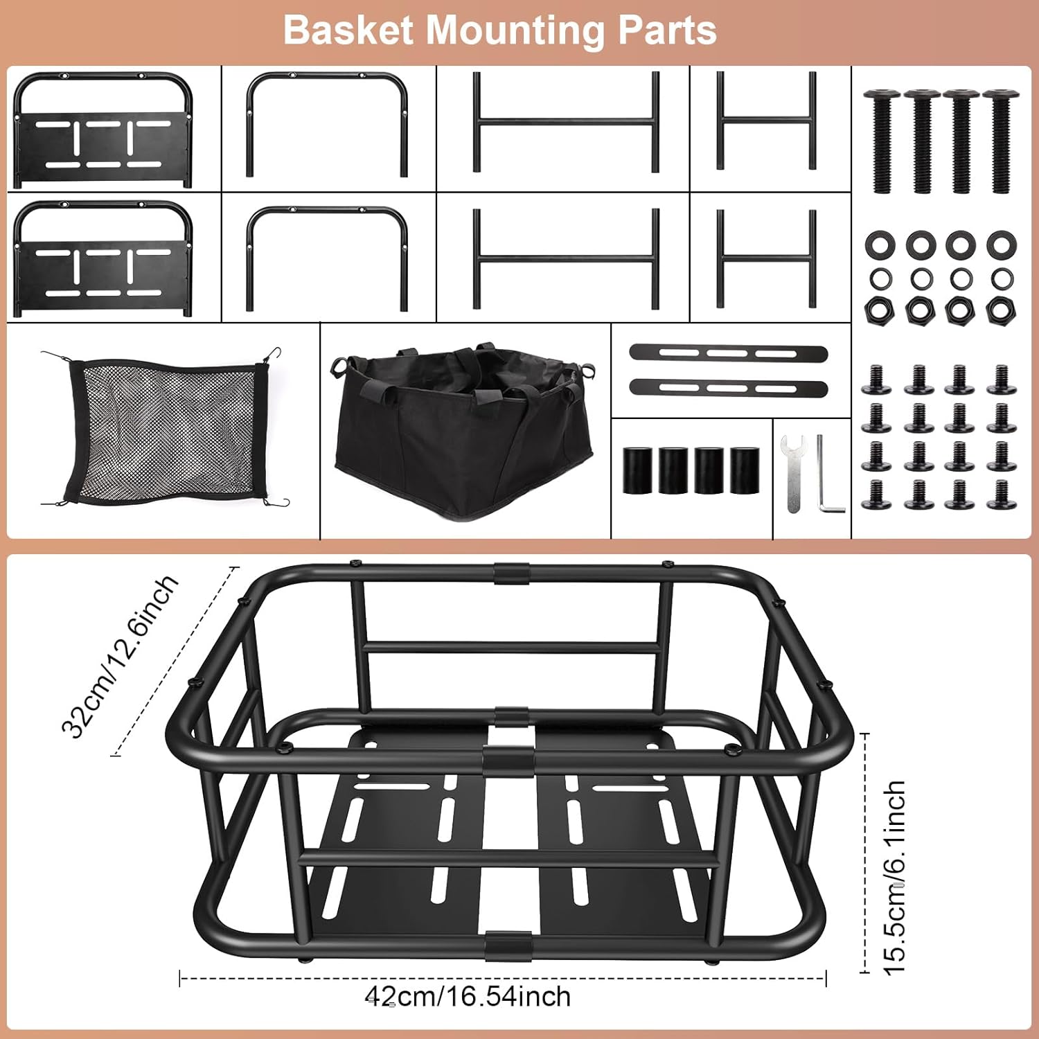 Rear Bike Basket: Versatile Cargo Solution for Bikes & E-Bikes Fed up with sore shoulders from backpacks or wobbly grocery bags on your handlebars? Our rear bike basket eliminates those hassles, holding daily essentials—coffee, phones, snacks, even small laptop bags—without slips, so you focus on riding. This 16.5X12.6X6-inch basket boasts a 110LB capacity, turning your bike/e-bike into a cargo workhorse. Commute with office supplies, explore with picnic gear, haul groceries/sports gear, or carry a small dog carrier—no more limits. Unlike flimsy, rust-prone wire baskets, it’s made of thick pipe steel (stable, deformation-resistant) with a rust-proof coating to withstand rain/mud. Maintenance is easy: just wipe clean with a damp cloth. It also comes with a protective liner (scratch/moisture protection), waterproof cover, and cargo net (for loose items). Setup is a breeze for novices and pros alike: removable mounting needs no complex tools, plus we include a detailed manual and all installation parts. Need help? Our team responds within 12 hours—even to check if it fits your bike rack. Upgrade your rides with convenience, durability, and versatility in one basket.