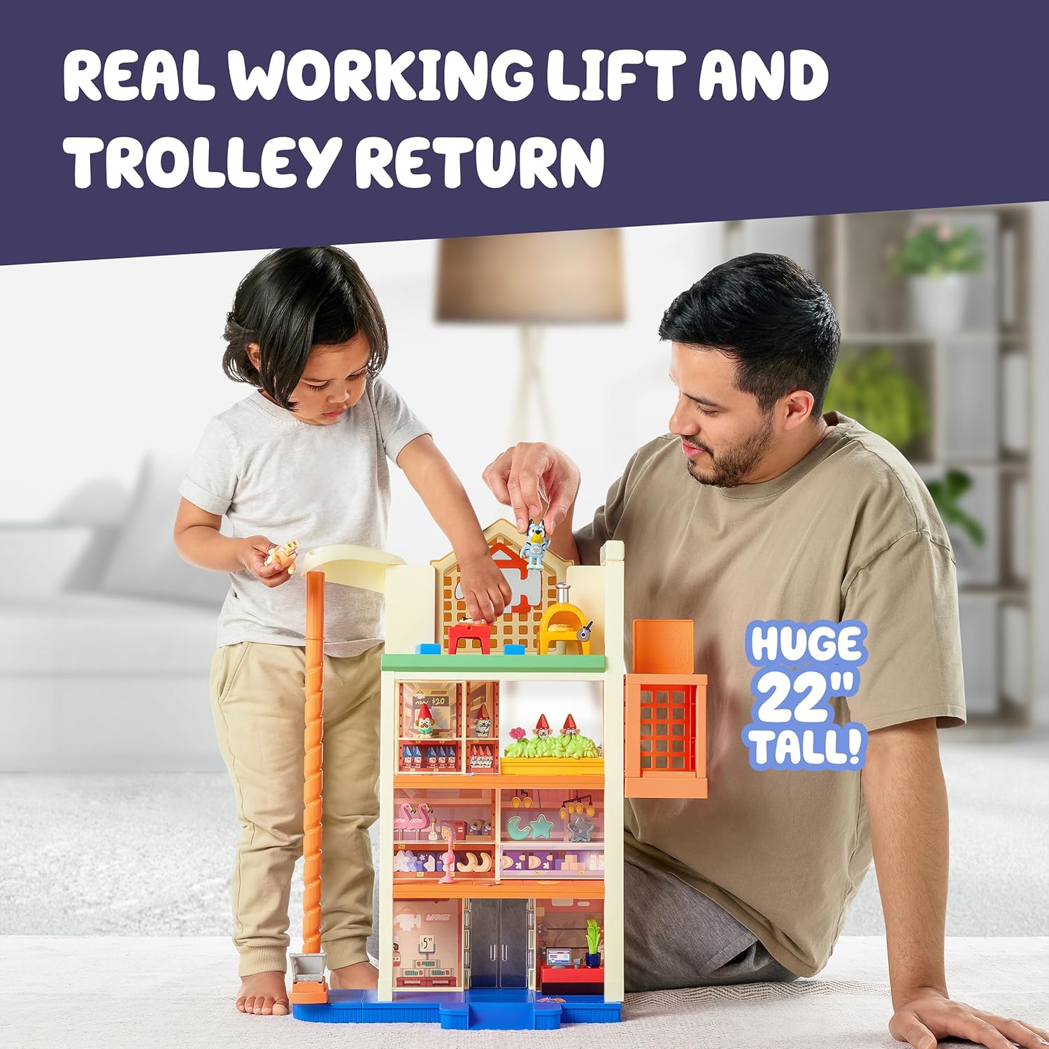 Moose Toys Bluey Hammerbarn Toy Store Playset: Bring the excitement of a shopping spree home with the Bluey Hammerbarn kids store play set and let kids step into the world of their favorite TV show. This 22-inch kids market features 4 levels and 9 different play areas packed with fun activities. Children can press the Paw Button to activate more than 45 lights and sounds, ride the real working lift from floor to floor, and watch the trolley spin down the return for an interactive and engaging shopping adventure. Standing 2.5 inches tall, the Bluey figurines are perfectly sized for little toddler hands and include Hammerbarn Bluey dressed as a store assistant, Shopping Bingo, Tradie, and even a garden gnome to delight young shoppers. The set comes with 15 accessories and a Ute vehicle for the Tradie figure to drive, while heaps of stickers allow children to decorate and customize their Hammerbarn play market. Built with a robust design that is both durable and easy to handle, this playset is ideal for preschoolers and toddlers ages 3 and above and promises endless playtime fun.