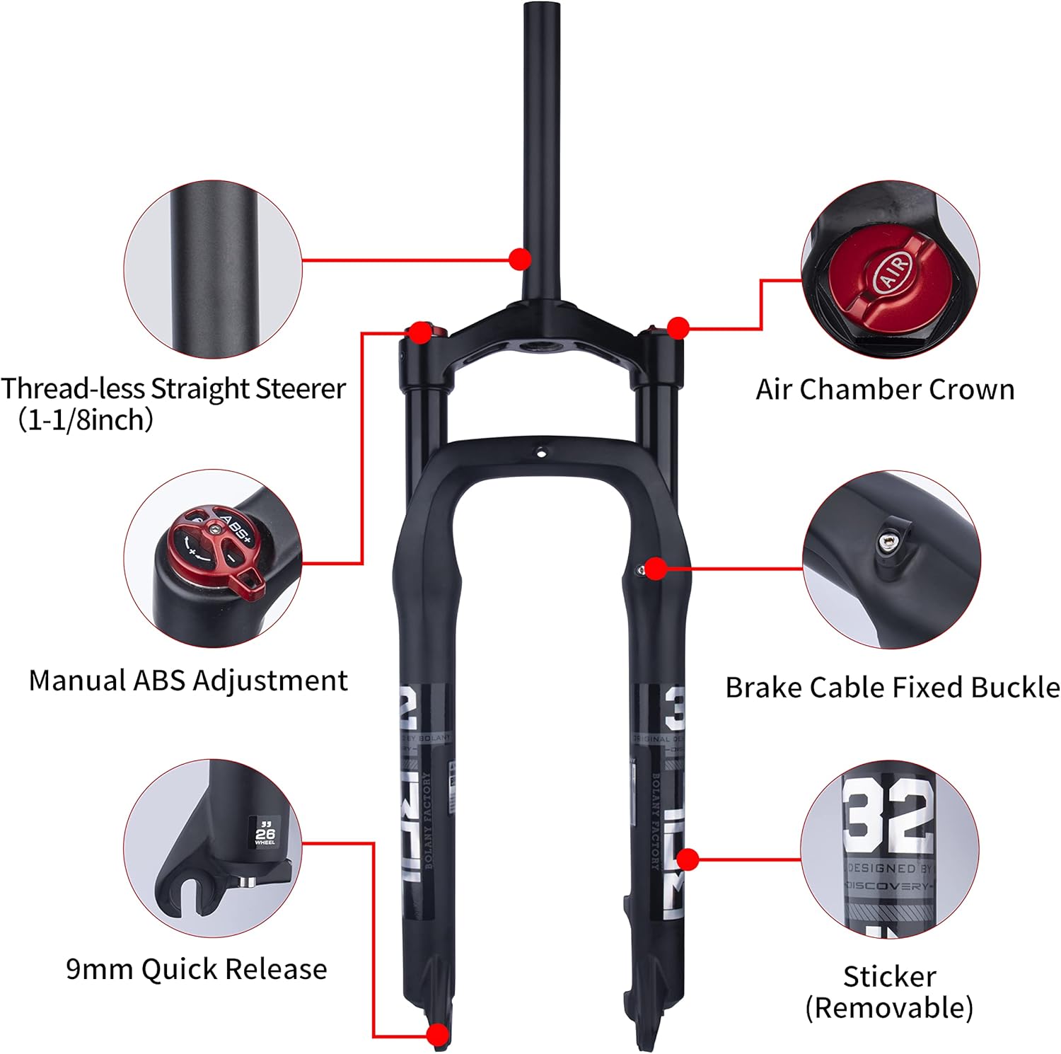 BOLANY Snow Fork Model:FK-001 Brand:Bolany Meterial: Aluminum alloy size:26 inch Spring: AIR Travel:100mm Axle:9mm Crown:Forged aluminum alloy Steerer: Alloy 28.6*30*220mm Lower leg:integrated fine polishing anodized 32mm Features:Rebound adjust,Lock-out system, Air spring Color:black Be applicable:Snow Bike Weave:2180g TIP: You need to carefully check your model and parameters before placing an order.If you are not sure your bike is compatible, Please consult in advance Purchase with confidence:Professional industry R&D team and more than 20 years of professional and technical personnel are our guarantee for providing quality products and high-end services! At present, our products are not only sold well in China, but also exported to many countries and have been recognized by everyone.The integrity and strength of Dongguan Kailun Bicycle Co., Ltd. have also been recognized by the industry.