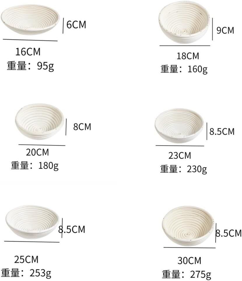 Made of nature rattan and come Cotton Cloth Liner6 Size: 16x6cm/6.3x2.4inch;20x8cm/8 inch ;18x9cm/7.1x3.54inch;23x8.5cm/9.06x3.35inch;25x8.5cm/10inch;30x8.5cm/12Inch;Package included: 6 pcs bread baskets & 6 LinersBest for making artisan bread,Both for home use or bread shop;Hand wash with warm water and keep dry after cleanPerfect for the Bread Baker: Our Bread Proofing Basket Set can be used for a variety of bread recipes, including sourdough, French bread, and more. You can start baking delicious bread at home.