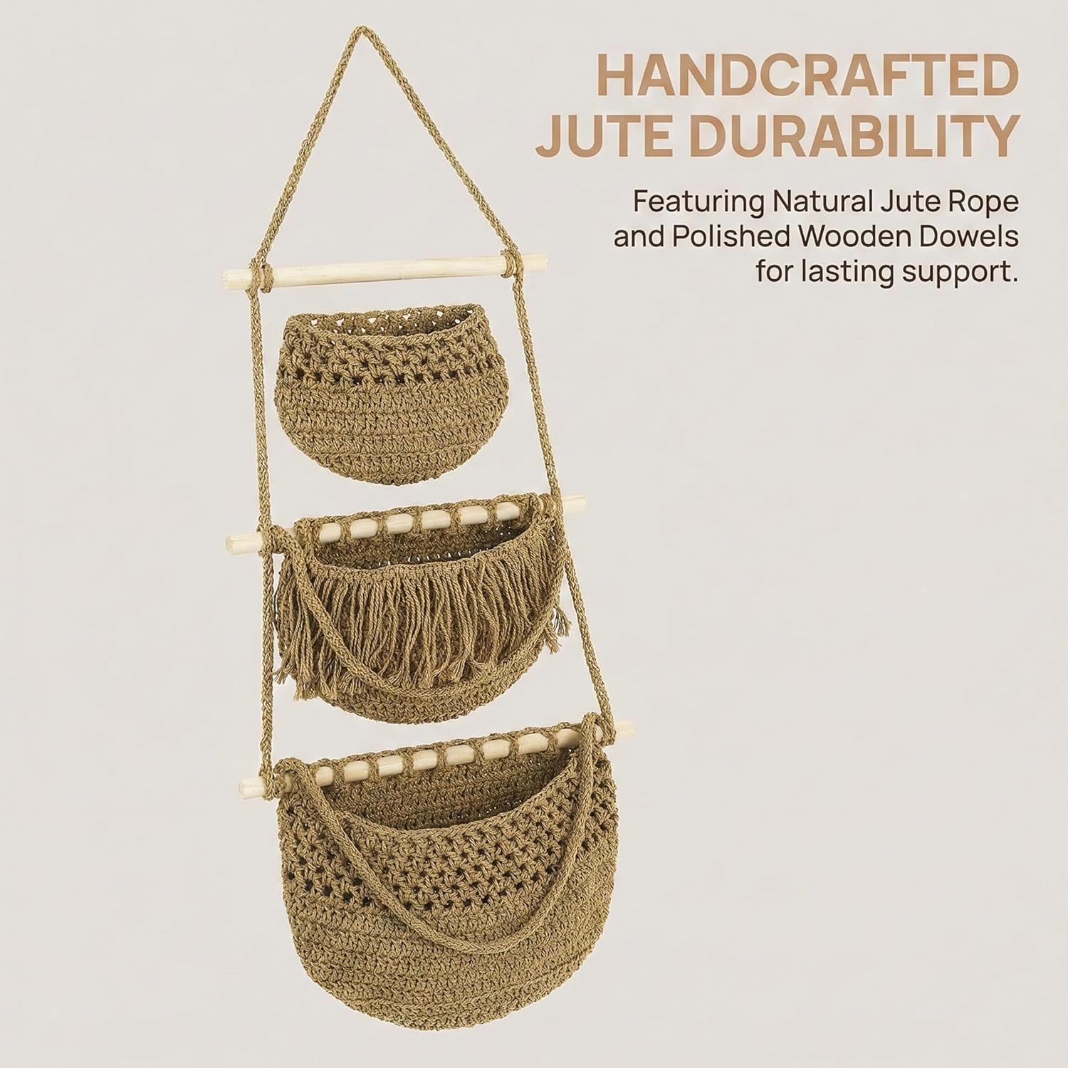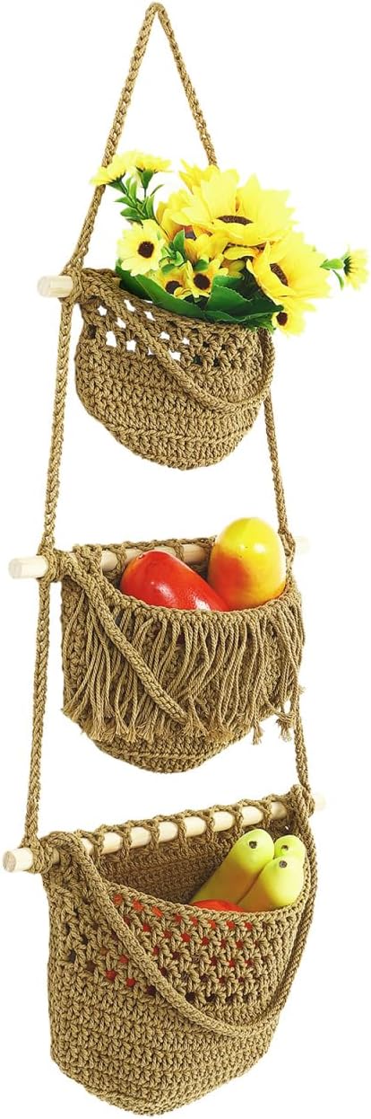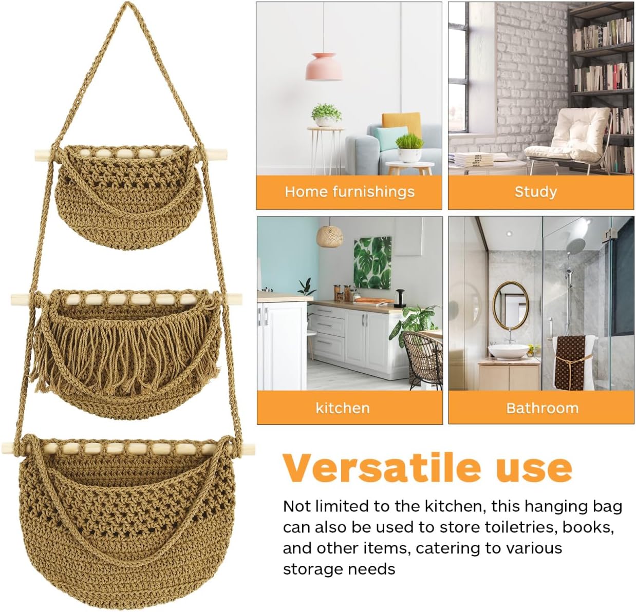 Cabilock 3 Tier Hanging Fruit Basket for Kitchen - Boho Macrame Woven Wall Storage for Onion and Potato, Space-Saving Cotton Rope Produce Organizer for Pantry & Bathroom