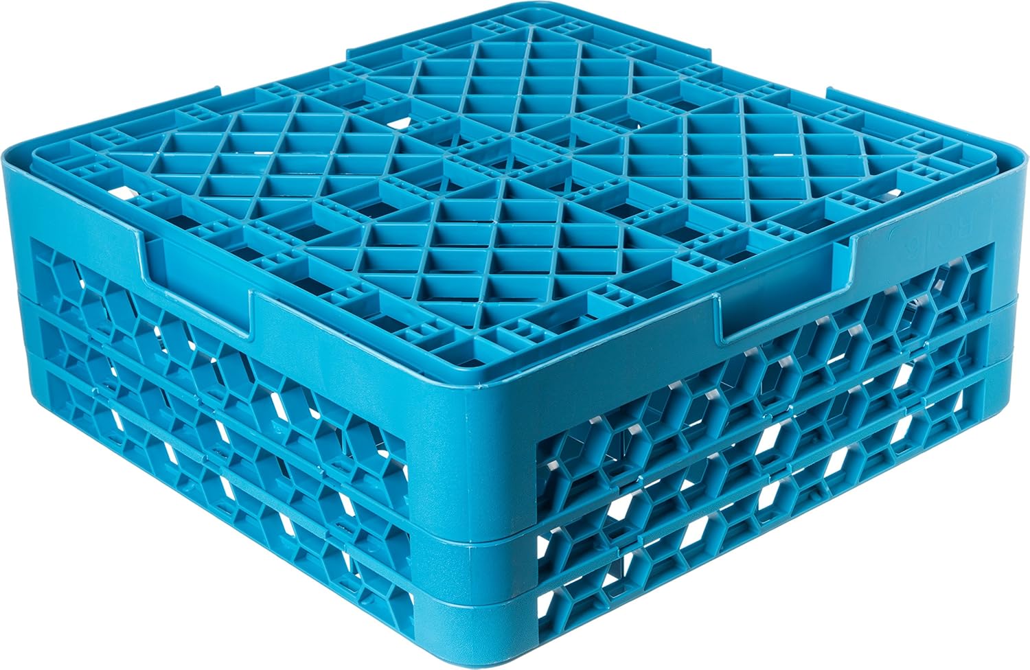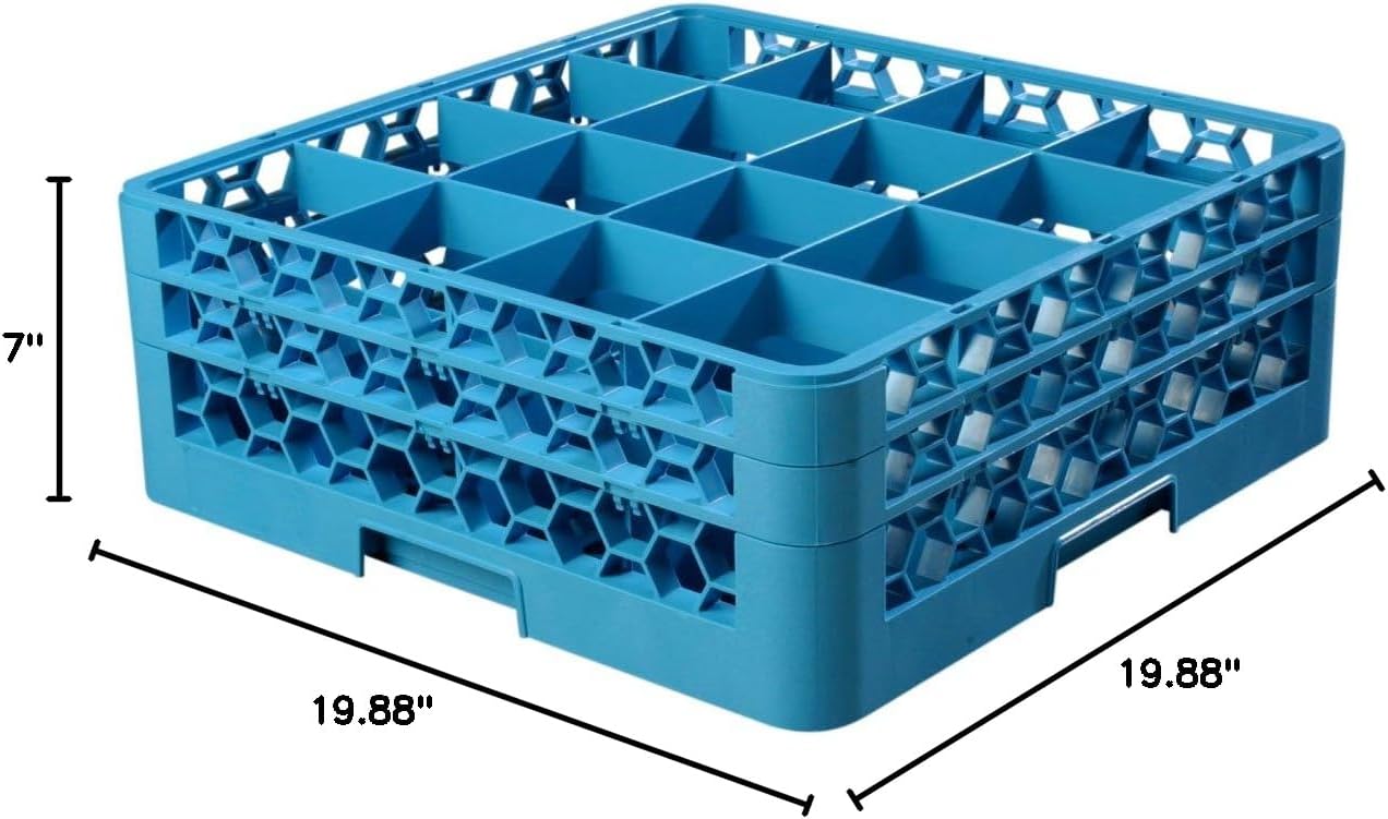Streamline your glassware washing with the Carlisle RG16-214 OptiClean 16-compartment blue glass rack with 2 extenders! Made with a reinforced polypropylene material, this glass rack is sturdy and durable, ideal for years of heavy use. Positive stacking from either direction makes this glass rack compatible with all major competitors. The textured surface resists scratches to keep your racks looking new, while also providing secure grip. The textured surface, paired with Comfort Curve handles that won't pinch fingers, allows for easy carrying by your staff. Best of all, the handles are molded into all four sides, for simple dish machine loading, without needing to rotate racks. The 4 1/2" square compartments are the perfect size for large cocktail glasses and delicate stemware like wine glasses with oversized bowls. The open profile allows for superior cleaning, rinsing, and drying. Since there are no flat surfaces, water and food particles can't get trapped inside the rack, ensuring proper draining. This 16-compartment glass rack is conveniently color-coded for easy rack size or glassware identification, and it comes with 2 blue extenders, designed to add an extra 1 1/2" of additional height per extender to your glass rack to assist in obtaining the proper depth for your taller glassware. This glass rack and extender set will make warewashing easier and more efficient than ever before since extenders can be easily snapped on. Overall Dimensions: Length: 19 7/8" Width: 19 7/8" Height: 7 1/8"