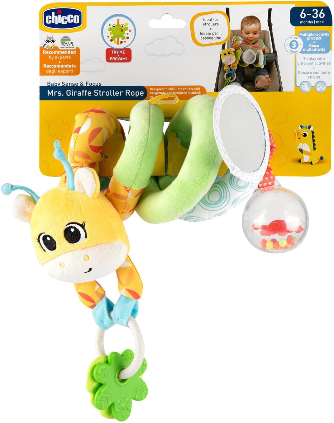Fun on the go with the Spiral Manual Activities that will keep boys and girls entertained both on their outdoor adventures and in the comfort of home. The Mister Giraffe toy is designed to offer a wide range of activities that will stimulate children's senses and curiosity. It includes a mirror with light effects for a fascinating visual element, a ring with soft plastic pendants that provide different textures to explore and a transparent ball with an adorable frog and mini sonic balls inside, generating cheerful and stimulating sounds. With this toy, babies will enjoy an enriching sensory experience. The mirror with light effects will allow them to explore their reflection and discover how light reflects and changes. Soft plastic pendants will offer them different shapes and textures to touch and manipulate. In addition, the transparent ball with sound balls will provide visual and auditory stimuli, stimulating their curiosity and developing their hand-eye coordination. The Mister Giraffe has been designed to provide comfort and practicality to parents and children. Its laces allow it to be easily attached to the pram bar, ensuring that the toy is always within reach of the child during their walks outdoors. This facilitates manipulation and play, allowing little ones to enjoy the activities without worry.