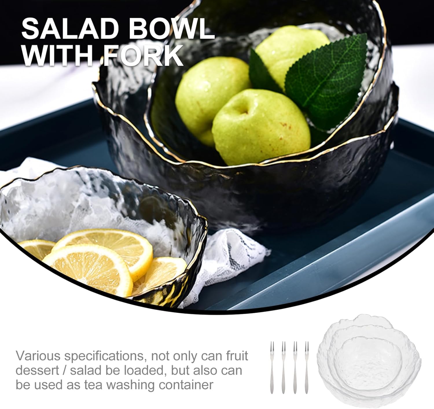 Package Include 3 x salad bowls 4 x forks Features -Size: 20.00X20.00X9.00cm/7.86X7.86X3.54in. -Product Info:Hammer pattern salad bowl -Material: Glass, stainless steel -Color: Transparent - Simple appearance design, beautiful and practical fruit bowl for kitchen counter. - Being a to your friend or family also be a good choice Glass dessert bowl. - There are 3 sizes glass bowls with 4 forks, healthy can be used at ease. - Used for filling all kinds of sushi, salad, side dishes, sauces, vinegar, etc serving salad bowl. - Perfect for dining table, buffet or restaurant, enjoy all your favorite delicacies and let people enjoy salad bowls.Goods Descriptiondessert bowls The creative patterns of these bowls make them more and creative.stainless steel dessert bowl No bad odor, the smooth surface of bowl will not hurt hands, beautiful and practical.fruit bowl bowl, which is made of , and can be used safely