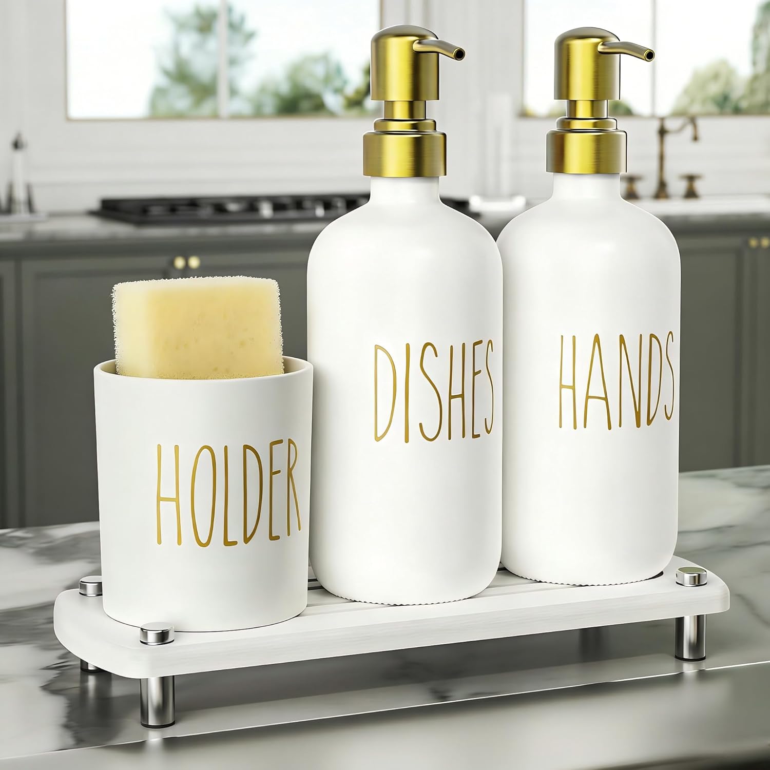 Cisily Gold Kitchen Soap Dispenser Set with Ceramics Sponge Holder and Brush Holder, Gold Pumps, and Instant Dry Tray, Hand and Dish Soap Dispenser Set Suitable for Kitchen Decor and Accessories