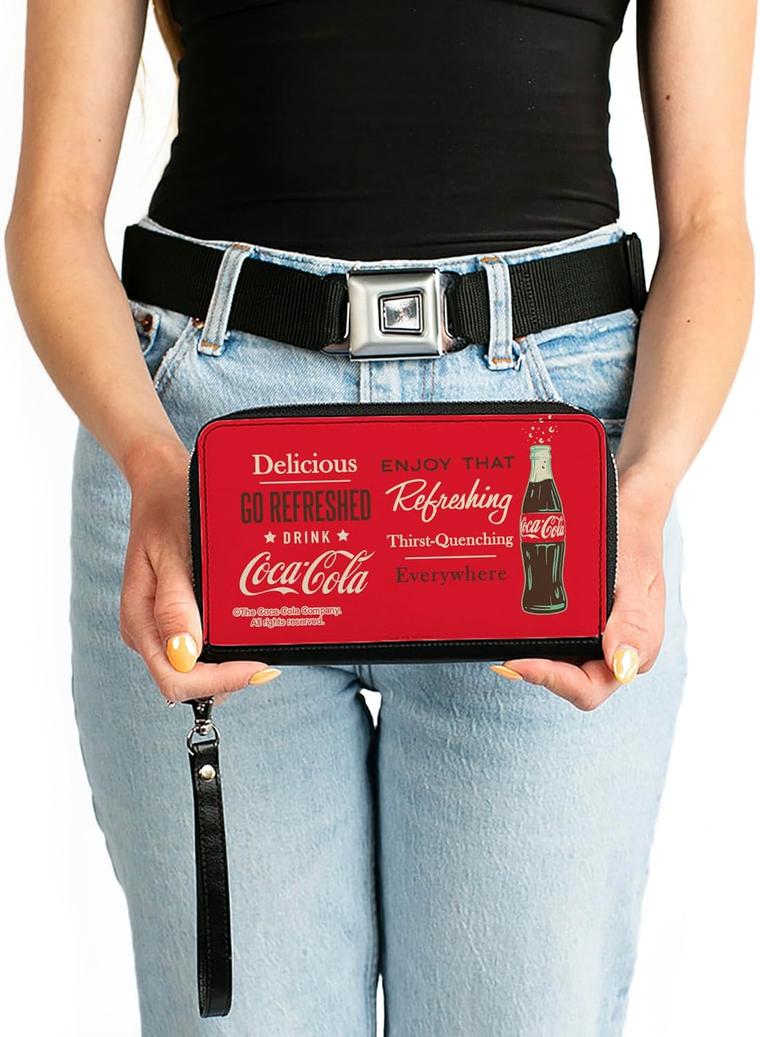You're going to love this wallet! Stylish and sleek this zip around wallet is made from premium vegan leather. It measures 7.5x4.5x1.0 Inches and features 2 billfolds, 6 card slots, 1 coin zipper, 1 windowed ID holder slot and a detachable wristlet strap for easy carrying. This wallet is spacious enough to carry large smartphones such as the iPhone 8 Plus, iPhone 11 Max. Galaxy Note 10 Plus and more! The gorgeous artwork is applied using the latest printing technology so it will hold up well over time. This product is assembled in the USA by Buckle-Down Inc. and Officially Licensed by The Coca-Cola Company.