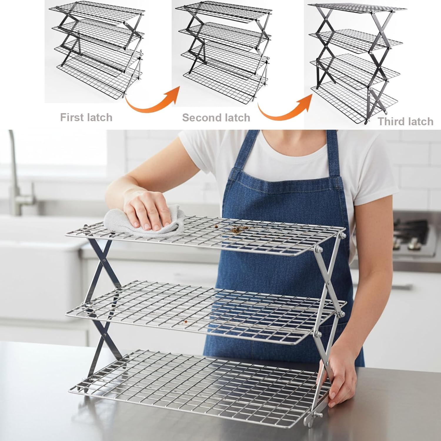 Description: The Collapsible Cooling Racks for Baking make an efficient, solution for cooling baked goods with a four-tier hollow-out iron structure that ensures stability while allowing air circulation for rapid cooling. Designed with adjustable spacing, it accommodates different sizes of cookies, pies, pancakes, and other baked treats while saving counter space by folding flat for easy storage. Its sturdy iron construction resists rust, making it a reliable kitchen accessory for frequent bakers. This collapsible, multi-tier cooling rack allows bakers to cool multiple batches simultaneously, boosting kitchen efficiency and making it suitable for both home and professional baking needs. Ideal for cookie cooling racks and versatile in use, this cooling rack combines practical design with convenient adjustability to enhance your baking and cooking experience. Features:. -Color: Silver. -Material: Iron. -Size: 43.5x45.5x25 cm/17.1x17.9x9.8 inch. Note:Manual measurement, please allow slight errors on size.The colors may exist slight difference due to different screens. Package Including 1 * Collapsible Cooling Rack