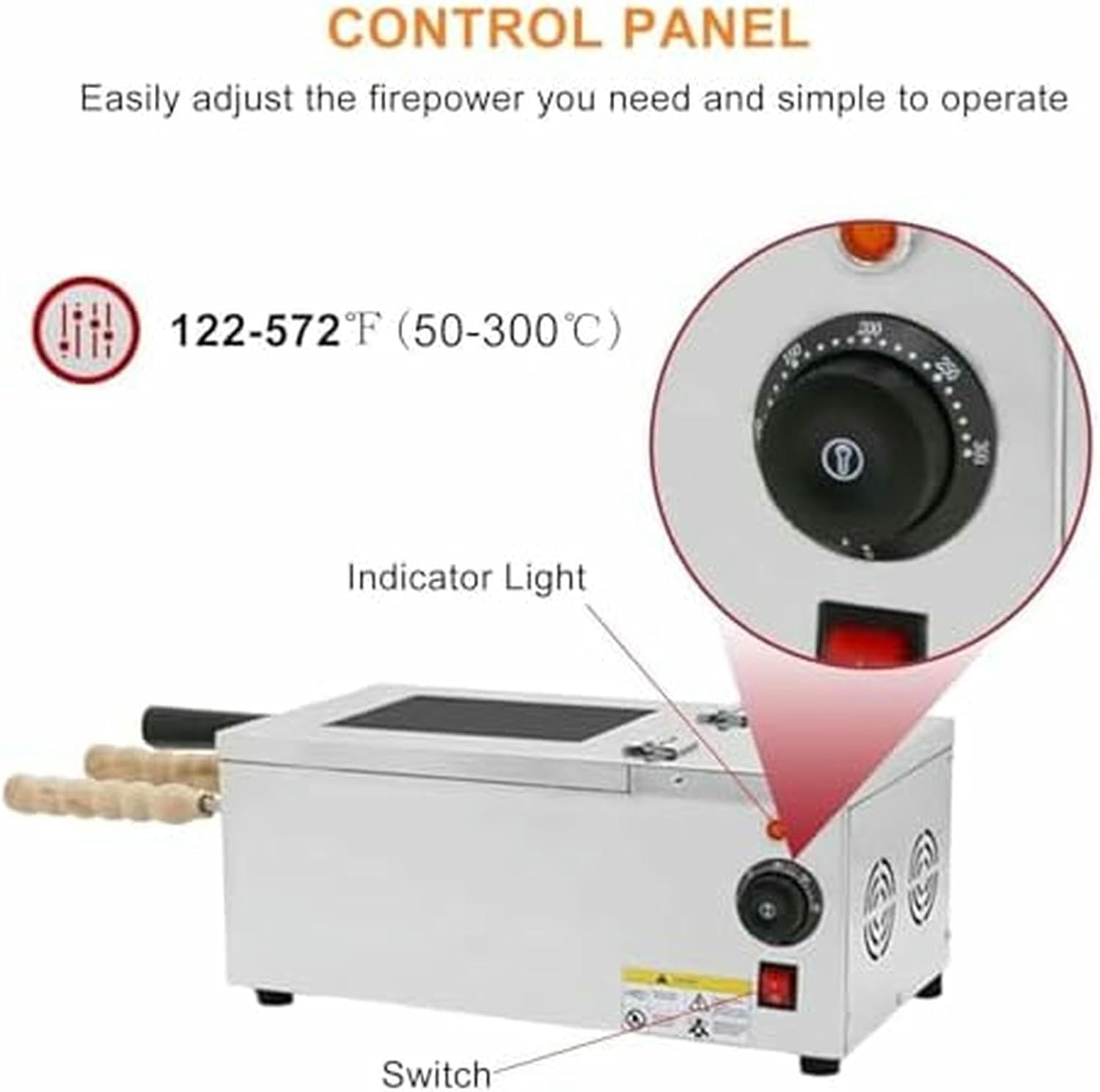 Cook Hungarian chimney cake effortlessly with this innovative oven maker, designed for quick and easy preparation of delicious treats. The chimney cake roll oven maker features M-types heating tubes for even heating and uniform baking, encased in a durable all stainless steel body. It includes a clear on/off switch and an adjustable temperature knob, ranging from 50°C to 300°C, ensuring sweet and crispy results every time. The electric toaster is equipped with a transparent skylight, allowing for easy monitoring of your baking progress without opening the oven.Parameters:Name: Chimney Waffle MakerVoltage: 110V/60Hz, 220-240V/50HzPower: 1500WMaterial: Stainless steel rolling cylinder + stainless steel shellMachine Size: 46*24*20cm (18*7.4*7.8in)Weight: 8 kg (17.6LB)Number of rollers: 2Roller Type: CylindricalTiming Function: 0-5 minutesRoller size: Diameter 40*length 214mmPackage size: 34*60*30cmPackage Included:1* Electric Chimney Cake Oven (with 2 baking wooden handles)