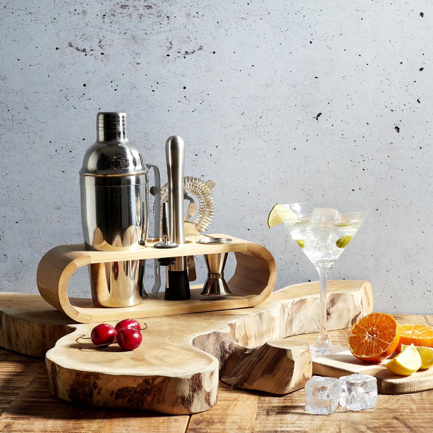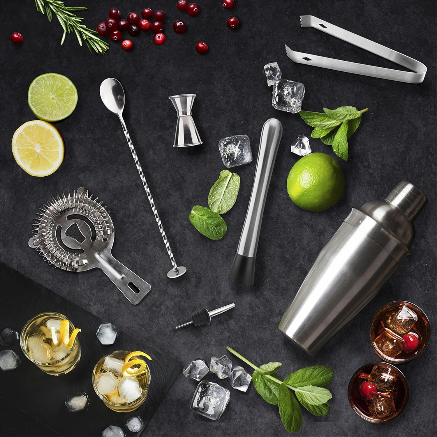 This cocktail box will delight any home cocktail lover. - Design - Contents: 1 bamboo stand, 1 stainless steel shaker, 1 stainless steel muddler, 1 stainless steel cocktail strainer, 1 stainless steel cocktail spoon, 1 stainless steel measuring cup 1 cl 2cl, 1 stainless steel pouring cap, 1 stainless steel tongs.