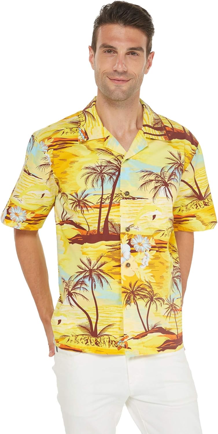 • ๐Ÿ‘• Menโ€™s Hawaiian Shirt โ€“ Relaxed short-sleeve button-up made from breathable 100% cotton, ideal for vacations, luaus, cruises, and beach parties.