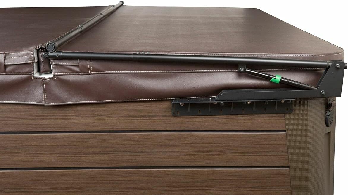 New Design with Full Center Bar. All Aluminum Construction. Dual Gas Shocks with Locking Feature. Works with Square and Rectangular Hot Tubs and is adjustable up to 106".
